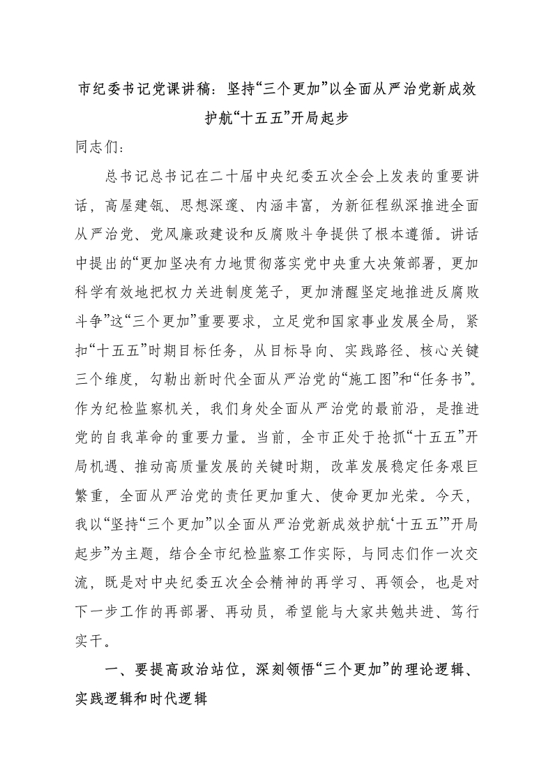 市纪委书记党课讲稿:坚持“三个更加”以全面从严治党新成效护航“十五五”开局起步同志们:总书记总书记在二十届中央纪委五次全会上发表的重要讲话,高屋建瓴、思想深邃、内涵丰富,为新征程纵深推进全面从严治党、党风廉政建设和反腐败斗争提供了根本遵循。讲话中提出的“更加坚决有力地贯彻落实党中央重大决策部署,更加科学有效地把权力关进制度笼子,更加清醒坚定地推进反腐败斗争”这“三个更加”重要要求,立足党和国家事业发展全局,紧扣“十五五”时期目标任务,从目标导向、实践路径、核心关键三个维度,勾勒出新时代全面从严治党的“施工图”和“任务书”。作为纪检监察机关,我们身处全面从严治党的最前沿,是推进党的自我革命的重要力量。当前,全市正处于抢抓“十五五”开局机遇、推动高质量发展的关键时期,改革发展稳定任务艰巨繁重,全面从严治党的责任更加重大、使命更加光荣。今天,我以“坚持“三个更加”以全面从严治党新成效护航‘十五五”开局起步”为主题,结合全市纪检监察工作实际,与同志们作一次交流,既是对中央纪委五次全会精神的再学习、再领会,也是对下一步工作的再部署、再动员,希望能与大家共勉共进、笃行一、要提高政治站位,深刻领悟“三个更加”的理论逻辑、实践逻辑和时代逻辑