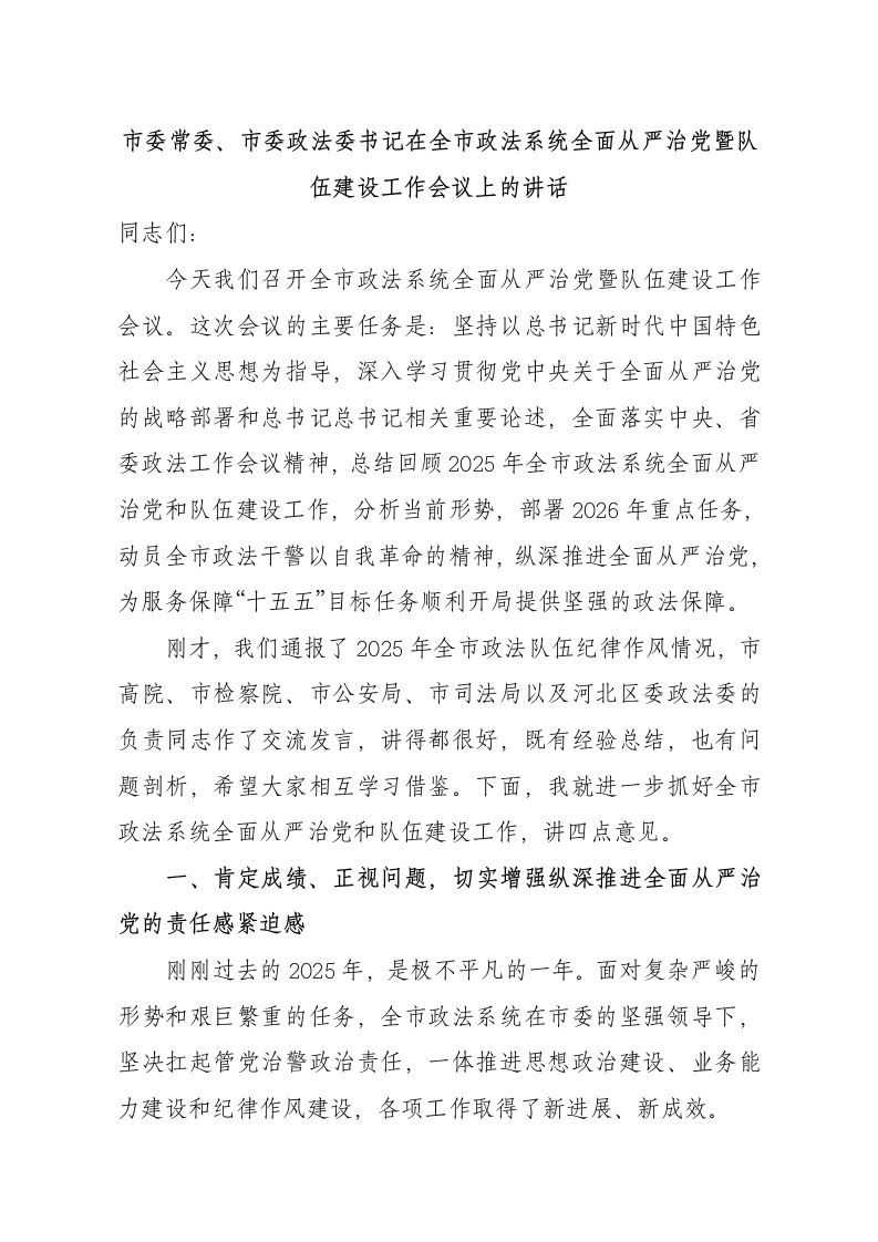 市委常委、市委政法委书记在全市政法系统全面从严治党暨队伍建设工作会议上的讲话同志们:今天我们召开全市政法系统全面从严治党暨队伍建设工作会议。这次会议的主要任务是:坚持以总书记新时代中国特色社会主义思想为指导,深入学习贯彻党中央关于全面从严治党的战略部署和总书记总书记相关重要论述,全面落实中央、省委政法工作会议精神,总结回顾2025年全市政法系统全面从严治党和队伍建设工作,分析当前形势,部署2026年重点任务,动员全市政法干警以自我革命的精神,纵深推进全面从严治党,为服务保障“十五五”目标任务顺利开局提供坚强的政法保障。刚才,我们通报了2025年全市政法队伍纪律作风情况,市高院、市检察院、市公安局、市司法局以及河北区委政法委的负责同志作了交流发言,讲得都很好,既有经验总结,也有问题剖析,希望大家相互学习借鉴。下面,我就进一步抓好全市政法系统全面从严治党和队伍建设工作,讲四点意见。一、肯定成绩、正视问题,切实增强纵深推进全面从严治党的责任感紧迫感刚刚过去的2025年,是极不平凡的一年。面对复杂严峻的形势和艰巨繁重的任务,全市政法系统在市委的坚强领导下,坚决扛起管党治警政治责任,一体推进思想政治建设、业务能力建设和纪律作风建设,各项工作取得了新进展、新成效。