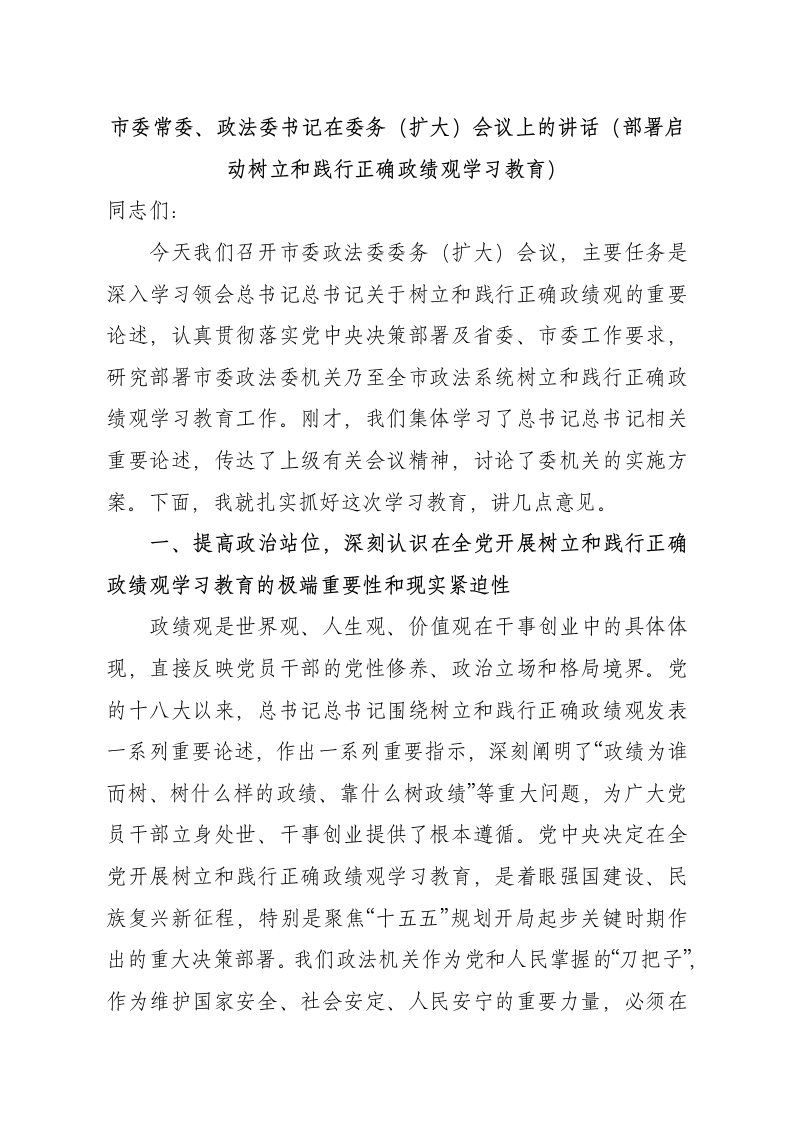市委常委、政法委书记在委务(扩大)会议上的讲话(部署启动树立和践行正确政绩观学习教育)同志们:今天我们召开市委政法委委务(扩大)会议,主要任务是深入学习领会总书记总书记关于树立和践行正确政绩观的重要论述,认真贯彻落实党中央决策部署及省委、市委工作要求,研究部署市委政法委机关乃至全市政法系统树立和践行正确政绩观学习教育工作。刚才,我们集体学习了总书记总书记相关重要论述,传达了上级有关会议精神,讨论了委机关的实施方案。下面,我就扎实抓好这次学习教育,讲几点意见。一、提高政治站位,深刻认识在全党开展树立和践行正确政绩观学习教育的极端重要性和现实紧迫性政绩观是世界观、人生观、价值观在干事创业中的具体体现,直接反映党员干部的党性修养、政治立场和格局境界。党的十八大以来,总书记总书记围绕树立和践行正确政绩观发表一系列重要论述,作出一系列重要指示,深刻阐明了“政绩为谁而树、树什么样的政绩、靠什么树政绩”等重大问题,为广大党员干部立身处世、干事创业提供了根本遵循。党中央决定在全党开展树立和践行正确政绩观学习教育,是着眼强国建设、民族复兴新征程,特别是聚焦“十五五”规划开局起步关键时期作出的重大决策部署。我们政法机关作为党和人民掌握的“刀把子”,作为维护国家安全、社会安定、人民安宁的重要力量,必须在