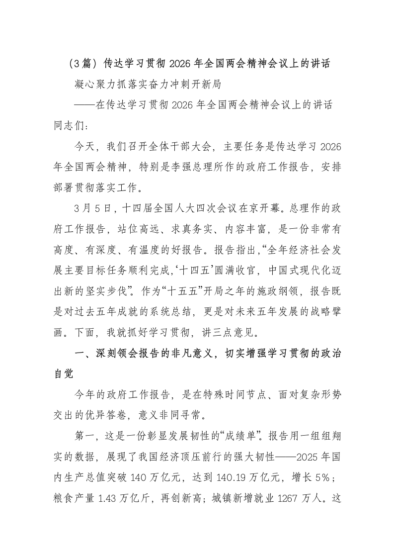 (3篇)传达学习贯彻2026年全国两会精神会议上的讲话凝心聚力抓落实奋力冲刺开新局一在传达学习贯彻2026年全国两会精神会议上的讲话同志们:今天,我们召开全体干部大会,主要任务是传达学习2026年全国两会精神,特别是李强总理所作的政府工作报告,安排部署贯彻落实工作。3月5日,十四届全国人大四次会议在京开幕。总理作的政府工作报告,站位高远、求真务实、内容丰富,是一份非常有高度、有深度、有温度的好报告。报告指出,“全年经济社会发展主要目标任务顺利完成,‘十四五’圆满收官,中国式现代化迈出新的坚实步伐”作为“十五五”开局之年的施政纲领,报告既是对过去五年成就的系统总结,更是对未来五年发展的战略擘画。下面,我就抓好学习贯彻,讲三点意见。一、深刻领会报告的非凡意义,切实增强学习贯彻的政治自觉今年的政府工作报告,是在特殊时间节点、面对复杂形势交出的优异答卷,意义非同寻常。第一,这是一份彰显发展韧性的“成绩单”报告用一组组翔实的数据,展现了我国经济顶压前行的强大韧性一2025年国内生产总值突破140万亿元,达到140.19万亿元,增长5%;粮食产量1.43万亿斤,再创新高;城镇新增就业1267万人。这