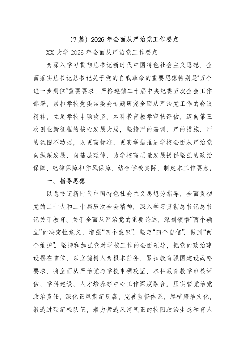 (7篇)2026年全面从严治党工作要点XX大学2026年全面从严治党工作要点为深入学习贯彻总书记新时代中国特色社会主义思想,全面落实总书记总书记关于党的自我革命的重要思想特别是“五个进一步到位”重要要求,严格遵循二十届中央纪委五次全会工作部署,紧扣学校党委常委会专题研究全面从严治党工作的会议精神,立足学校申硕攻坚、本科教育教学审核评估、迈向第三次创业新征程的核心发展大局,坚持严的基调、严的措施、严的氛围不动摇,以更高标准、更实举措推进学校全面从严治党向纵深发展、向基层延伸,为学校高质量发展提供坚强的政治保障、纪律保障和作风保障,结合学校实际,制定本工作要点。一、指导思想以总书记新时代中国特色社会主义思想为指导,全面贯彻党的二十大和二十届历次全会精神,深入学习贯彻总书记总书记关于教育、关于全面从严治党的重要论述,深刻领悟“两个确立”的决定性意义,增强“四个意识”坚定“四个自信”做到“两个维护”坚持和加强党对学校工作的全面领导,把党的政治建设摆在首位,以立德树人为根本任务,紧扣教育强国建设战略要求,将全面从严治党与学校申硕攻坚、本科教育教学审核评估、学科建设、人才培养等中心工作深度融合。压实管党治党政治责任,深化正风肃纪反腐,完善监督体系,厚植廉洁文化,锻造过硬纪检队伍,着力营造风清气正的校园政治生态和育人