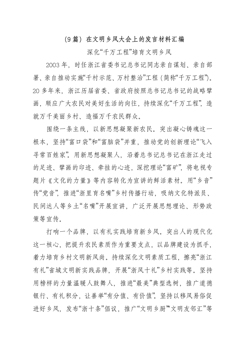 (9篇)在文明乡风大会上的发言材料汇编深化“千万工程”培育文明乡风2003年,时任浙江省委书记总书记同志亲自谋划、亲自部署、亲自推动实施“千村示范、万村整治”工程(简称“千万工程)。20多年来,浙江历届省委、省政府按照总书记总书记的战略擘画,顺应广大农民对美好生活的向往,持续深化“千万工程”,造就万千美丽乡村、造福万千农民群众。围绕一条主线,以新思想凝聚新农民。突出凝心铸魂这一根本,坚持“富口袋”和“富脑袋”并重,推动党的创新理论“飞入寻常百姓家”用新思想凝聚人,沿着总书记总书记在浙江走过的足迹、擘画的印