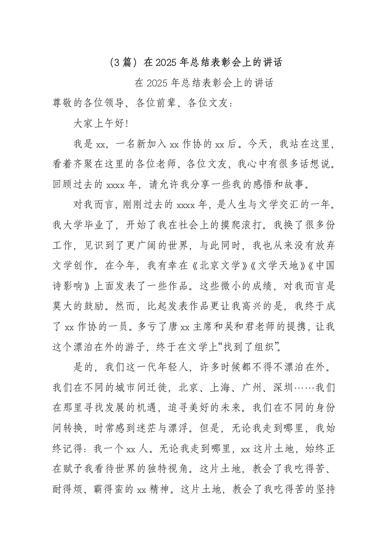 (3篇)在2025年总结表彰会上的讲话在2025年总结表彰会上的讲话尊敬的各位领导、各位前辈、各位文友:大家上午好!我是双,一名新加入双作协的双后。今天,我站在这里,看着齐聚在这里的各位老师、各位文友,我心中有很多话想说。回顾过去的xx年,请允许我分享一些我的感悟和故事。对我而言,刚刚过去的x年,是人生与文学交汇的一年。我大学毕业了,开始了我在社会上的摸爬滚打。我换了很多份工作,见识到了更广阔的世界,与此同时,我也从来没有放弃文学创作。在今年,我有幸在《北京文学》《文学天地》《中国诗影响》上面发表了一些作品。
