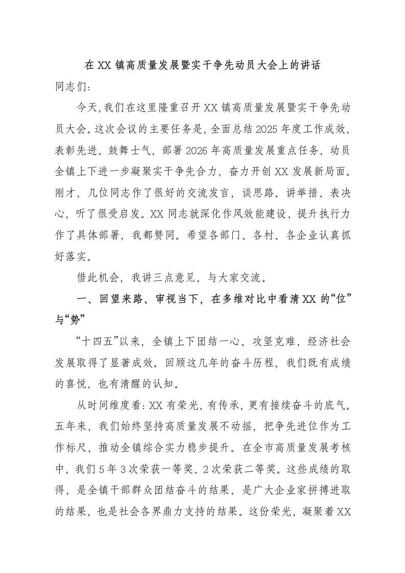 在X镇高质量发展暨实干争先动员大会上的讲话同志们:今天,我们在这里隆重召开XX镇高质量发展暨实干争先动员大会。这次会议的主要任务是,全面总结2025年度工作成效,表彰先进、鼓舞士气,部署2026年高质量发展重点任务,动员全镇上下进一步凝聚实干争先合力,奋力开创XX发展新局面。刚才,几位同志作了很好的交流发言,谈思路、讲举措、表决心,听了很受启发。X同志就深化作风效能建设、提升执行力作了具体部署,我都赞同。希望各部门、各村、各企业认真抓好落实。借此机会,我讲三点意见,与大家交流。一、回望来路、审视当下,在多维对