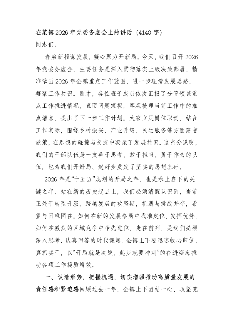 在某镇2026年党委务虚会上的讲话(4140字)同志们:春启新程谋发展,凝心聚力开新局。今天,我们召开2026年党委务虚会,主要任务是深入贯彻落实上级决策部署,精准擘画2026年全镇重点工作蓝图,进一步理清发展思路、凝聚工作共识。刚才,各位班子成员依次汇报了分管领域重点工作推进情况,直面问题短板,客观梳理当前工作中的难点堵点,提出了下一步工作计划。大家立足岗位职责、结合工作实际,围绕乡村振兴、产业升级、民生服务等方面建言献策,在思想的碰撞与交流中凝聚了发展共识。这充分说明,我们的干部队伍是一支善于思考、敢于担当、