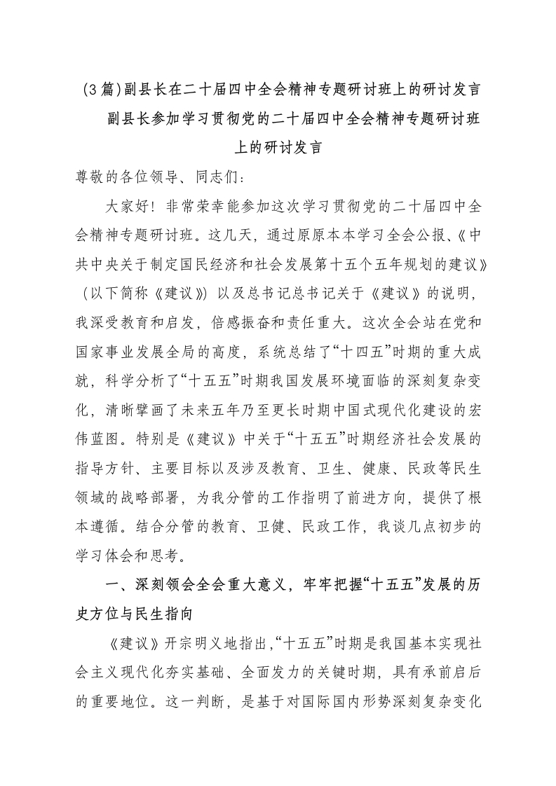 (3篇)副县长在二十届四中全会精神专题研讨班上的研讨发言副县长参加学习贯彻党的二十届四中全会精神专题研讨班上的研讨发言尊敬的各位领导、同志们:大家好!非常荣幸能参加这次学习贯彻党的二十届四中全会精神专题研讨班。这几天,通过原原本本学习全会公报、《中共中央关于制定国民经济和社会发展第十五个五年规划的建议》(以下简称《建议》以及总书记总书记关于《建议》的说明,我深受教育和启发,倍感振奋和责任重大。这次全会站在党和国家事业发展全局的高度,系统总结了“十四五”时期的重大成就,科学分析了“十五五”时期我国发展