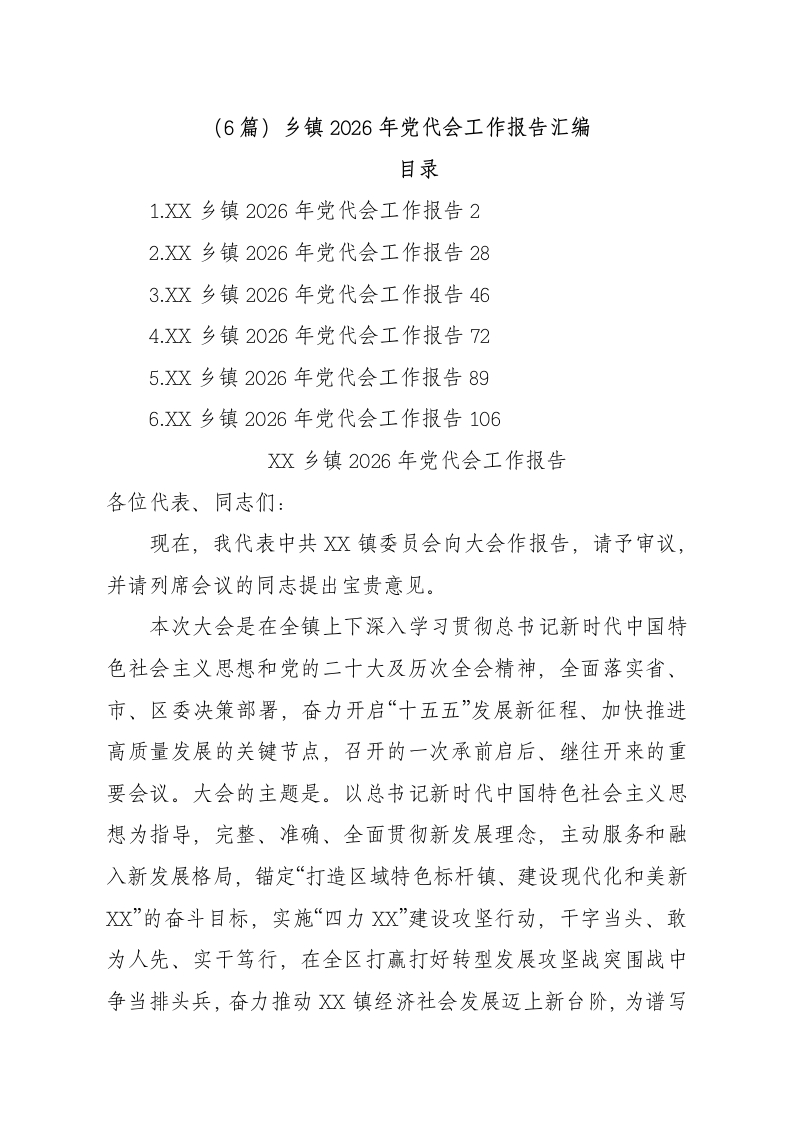 (6篇)乡镇2026年党代会工作报告汇编目录1.X乡镇2026年党代会工作报告22.XX乡镇2026年党代会工作报告283.XX乡镇2026年党代会工作报告464.X乡镇2026年党代会工作报告725.XX乡镇2026年党代会工作报告896.XX乡镇2026年党代会工作报告106XX乡镇2026年党代会工作报告各位代表、同志们:现在,我代表中共X镇委员会向大会作报告,请予审议,并请列席会议的同志提出宝贵意见。本次大会是在全镇上下深入学习贯彻总书记新时代中国特色社会主义思想和党的二十大及历次全会精神,全面落实省、市、区委决策部署,奋力开启“十五五”发展新征程、加快推进