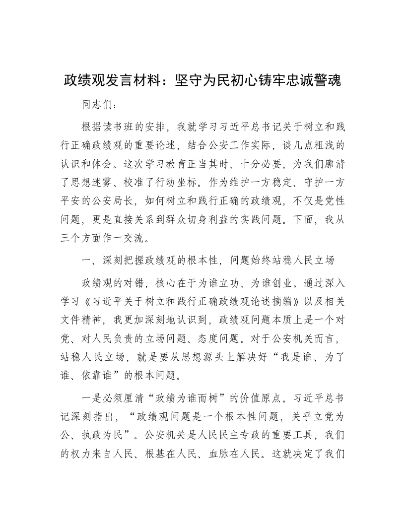 政绩观发言材料:坚守为民初心铸牢忠诚警魂