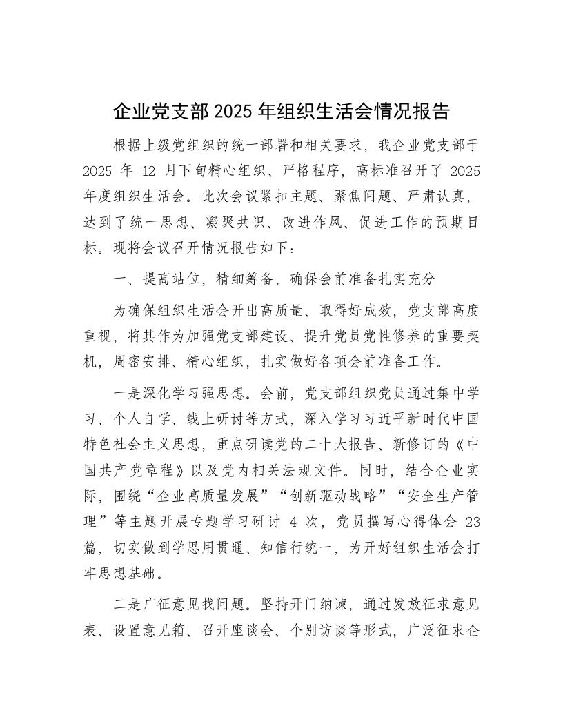 企业党支部2025年组织生活会情况报告