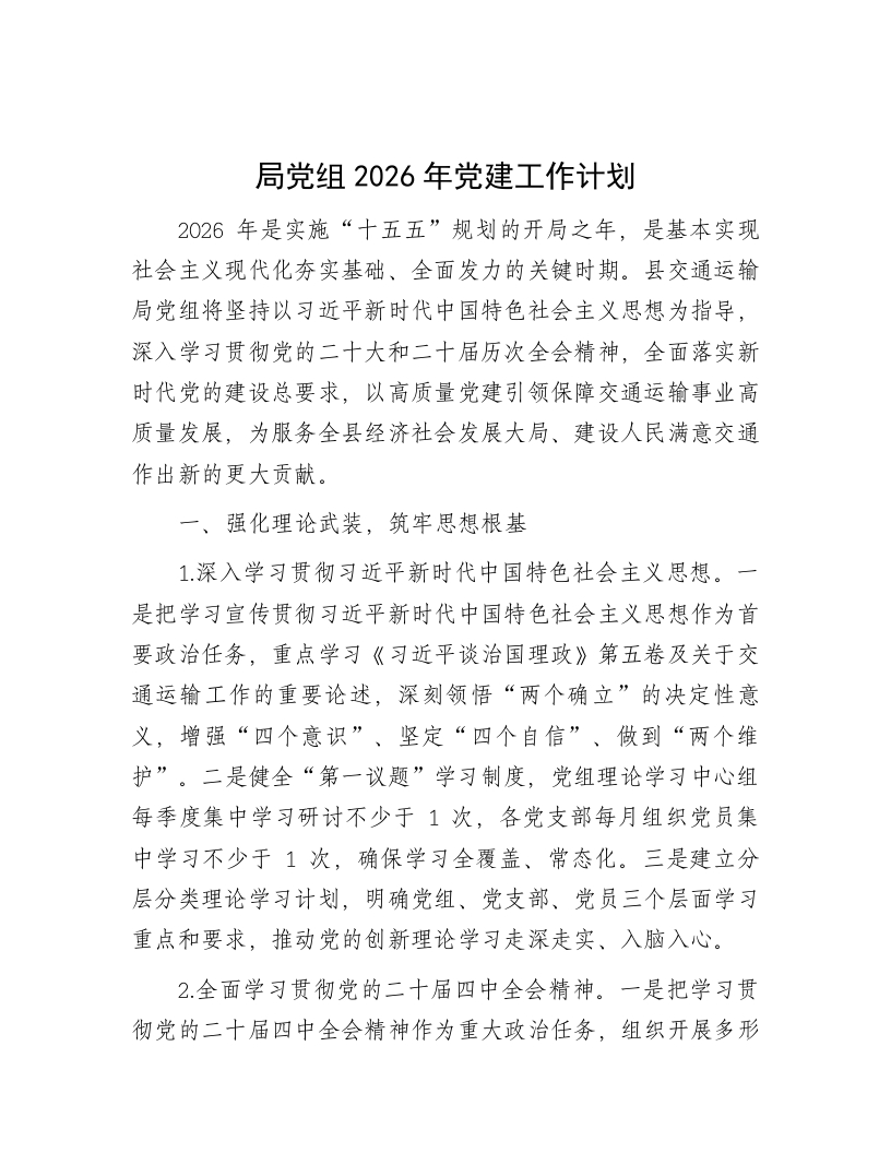 2026年是实施“十五五”规划的开局之年,是基本实现社会主义现代化夯实基础、全面发力的关键时期。县交通运输局党组将坚持以习近平新时代中国特色社会主义思想为指导,深入学习贯彻党的二十大和二十届历次全会精神,全面落实新时代党的建设总要求,以高质量党建引领保障交通运输事业高质量发展,为服务全县经济社会发展大局、建设人民满意交通作出新的更大贡献。