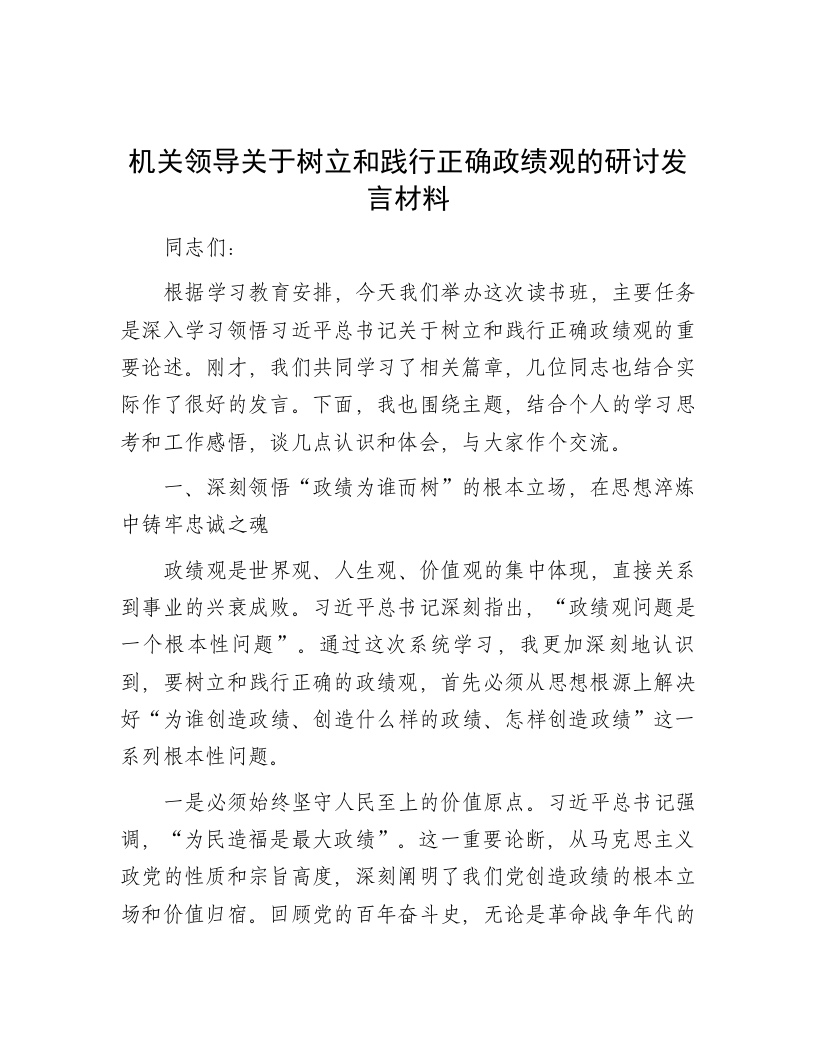 机关领导关于树立和践行正确政绩观的研讨发言材料