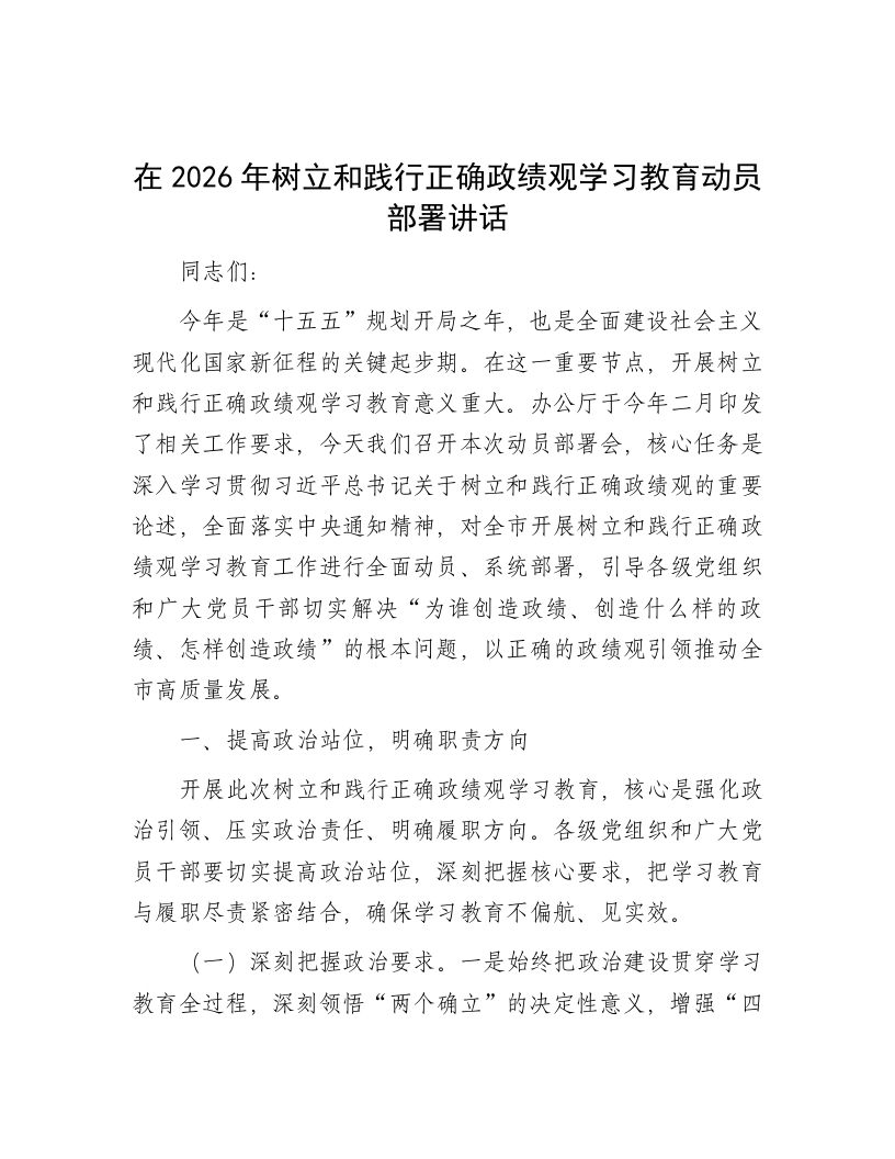 在2026年树立和践行正确政绩观学习教育动员部署讲话