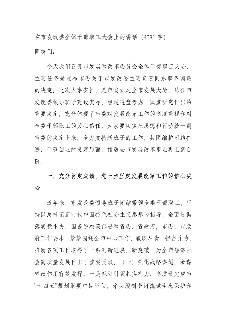 在市发改委全体干部职工大会上的讲话(4681字)