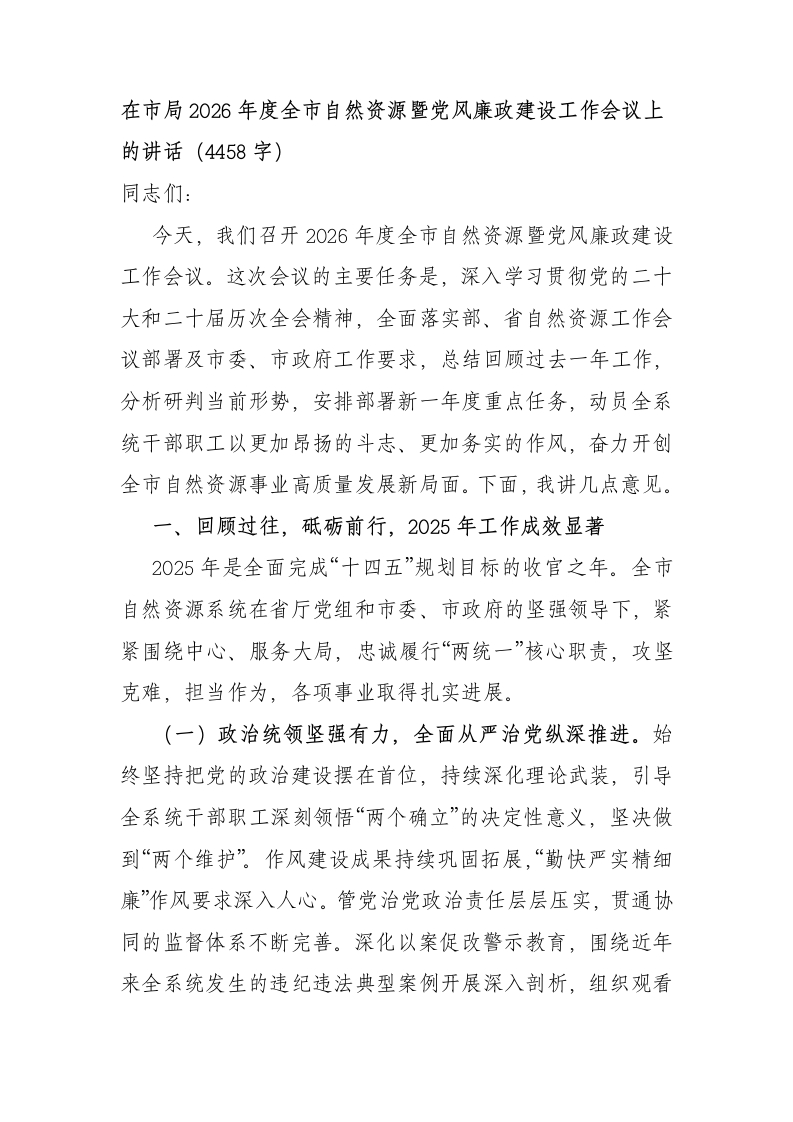 在市局2026年度全市自然资源暨党风廉政建设工作会议上的讲话(4458字)