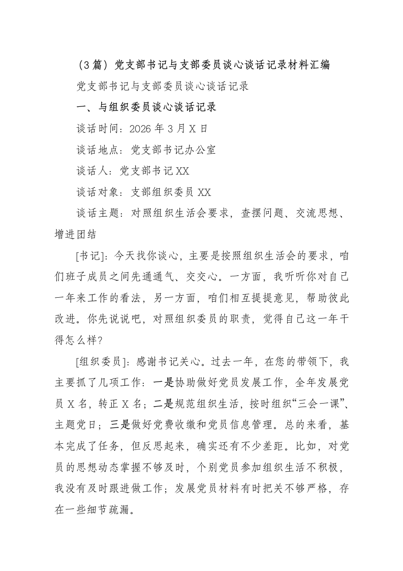 (3篇)党支部书记与支部委员谈心谈话记录材料汇编