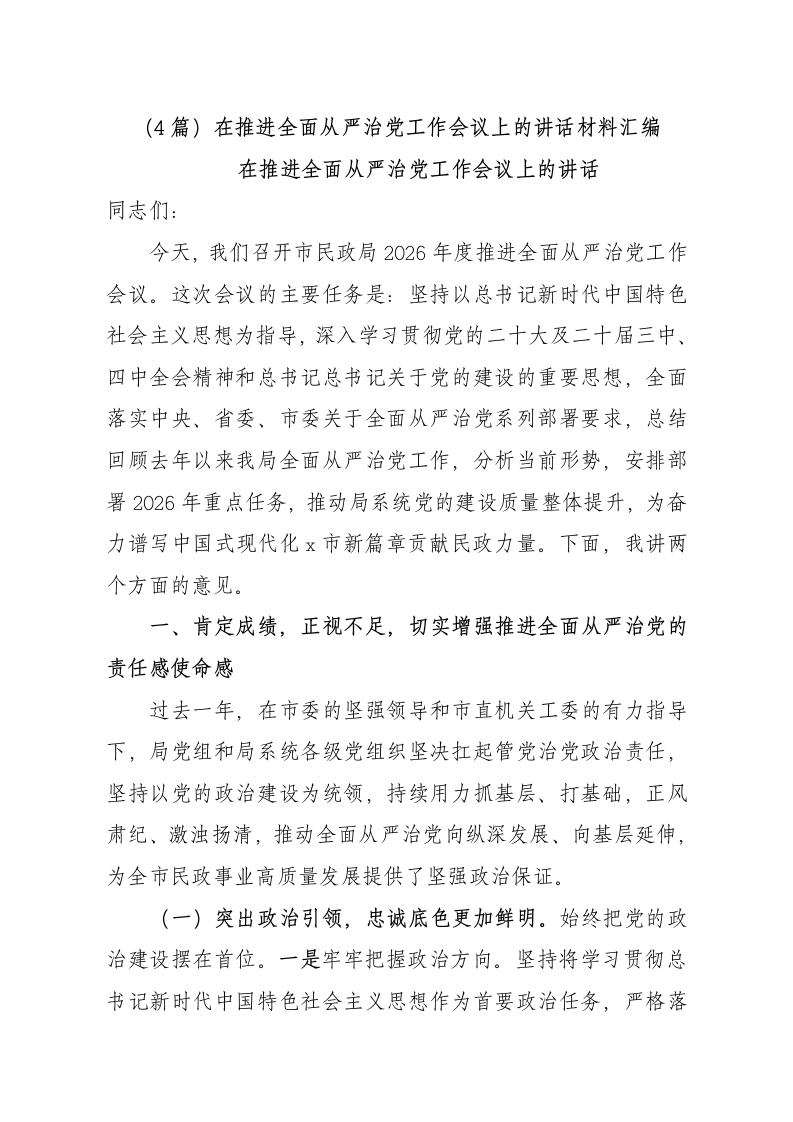今天,我们召开市民政局2026年度推进全面从严治党工作会议。这次会议的主要任务是:坚持以总书记新时代中国特色社会主义思想为指导,深入学习贯彻党的二十大及二十届三中、四中全会精神和总书记总书记关于党的建设的重要思想,全面落实中央、省委、市委关于全面从严治党系列部署要求,总结回顾去年以来我局全面从严治党工作,分析当前形势,安排部署2026年重点任务,推动局系统党的建设质量整体提升,为奋力谱写中国式现代化x市新篇章贡献民政力量。下面,我讲两个方面的意见。
