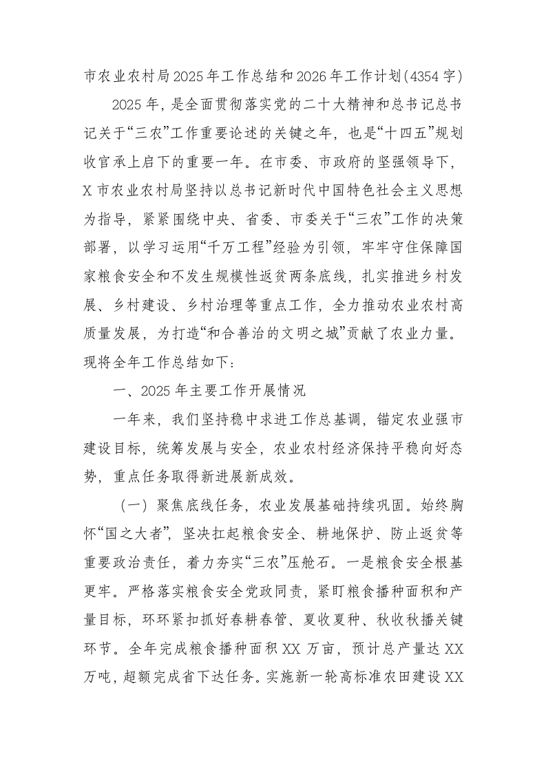 市农业农村局2025年工作总结和2026年工作计划(4354字)2025年,是全面贯彻落实党的二十大精神和总书记总书记关于“三农”工作重要论述的关键之年,也是“十四五”规划收官承上启下的重要一年。在市委、市政府的坚强领导下,X市农业农村局坚持以总书记新时代中国特色社会主义思想为指导,紧紧围绕中央、省委、市委关于“三农”工作的决策部署,以学习运用“千万工程”经验为引领,牢牢守住保障国家粮食安全和不发生规模性返贫两条底线,扎实推进乡村发展、乡村建设、乡村治理等重点工作,全力推动农业农村高质量发展,为打造“和合善治的文明之城”贡献了农业力量。现将全年工作总结如下:一、2025年主要工作开展情况一年来,我们坚持稳中求进工作总基调,锚定农业强市建设目标,统筹发展与安全,农业农村经济保持平稳向好态势,重点任务取得新进展新成效。(一)聚焦底线任务,农业发展基础持续巩固。始终胸怀“国之大者”,坚决扛起粮食安全、耕地保护、防止返贫等重要政治责任,着力夯实“三农”压舱石。一是粮食安全根基更牢。严格落实粮食安全党政同责,紧盯粮食播种面积和产量目标,环环紧扣抓好春耕春管、夏收夏种、秋收秋播关键环节。全年完成粮食播种面积X万亩,预计总产量达XX万吨,超额完成省下达任务。实施新一轮高标准农田建设XX万亩,同步推进高效节水灌溉,农田基础设施持续改善。扎实做好农业生产防灾减灾,密切监测病虫害和气象灾害,发布预警信息X条,落实防控措施X万亩次,最大限度降低了灾害损失。二是脱贫成果更巩固。严格落实“四个不摘”要求,健全防止返贫动态监测和帮扶机制,对易返贫致贫人口早发现、早干预、早帮扶。聚焦产业和就业两个关键,投入衔接资金XX万元,实施特色产业帮扶项目X个,脱贫人口务工规模稳定在X人以上,脱贫人口人均纯收入保持稳定增长。三是耕地保护红线更紧。采取“长牙齿”的硬措施保护耕地,坚决遏制耕地“非农化”、防止“非粮化”。完成耕地保护目标责任考核,持续推进撂荒地整治利用,确保耕地数量不减少、质量有提升。推广保护性耕作、有机肥施用等技术,完成深松整地X万亩,土壤有机质含量稳步提高。(二)聚焦提质增效,乡村产业发展势头良好。以构建现代乡村产业体系为目标,着力做优特色产业、做强经营主体、做活产业融合,乡村内生发展动力不断增强。一是特色产业扩规提质。在稳定粮食生产的同时,深入调整优化农业结构。蔬菜、畜牧、特色林果等优势产业持续壮大,新增设施农业面积X亩,改造提升规模化养殖场X个。积极发展“一村一品”,培育壮大永昌羊肉、X高原夏菜等区域公用品牌,金川区宁远堡镇龙景村成功入选全国乡村旅游重点村,乡村经济业态更加丰富。二是经营主体活力增强。实施新型