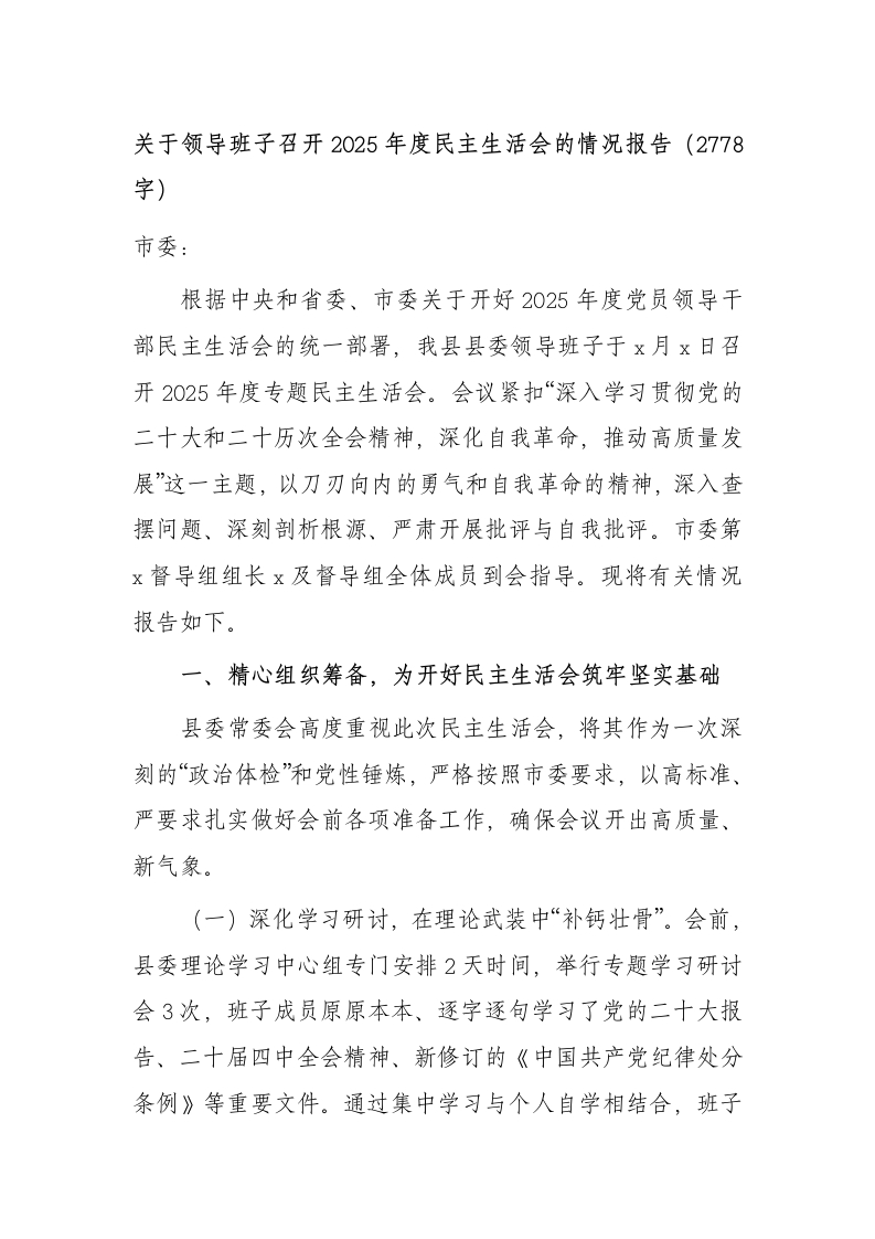 关于领导班子召开2025年度民主生活会的情况报告(2778字)市委:根据中央和省委、市委关于开好2025年度党员领导千部民主生活会的统一部署,我县县委领导班子于x月x日召开2025年度专题民主生活会。会议紧扣“深入学习贯彻党的二十大和二十历次全会精神,深化自我革命,推动高质量发展”这一主题,以刀刃向内的勇气和自我革命的精神,深入查摆问题、深刻剖析根源、严肃开展批评与自我批评。市委第x督导组组长x及督导组全体成员到会指导。现将有关情况报告如下。一、精心组织筹备,为开好民主生活会筑牢坚实基础县委常委会高度重视此次民主生活会,将其作为一次深刻的“政治体检”和党性锤炼,严格按照市委要求,以高标准、严要求扎实做好会前各项准备工作,确保会议开出高质量、新气象。(一)深化学习研讨,在理论武装中“补钙壮骨”。会前,县委理论学习中心组专门安排2天时间,举行专题学习研讨会3次,班子成员原原本本、逐字逐句学习了党的二十大报告、二十届四中全会精神、新修订的《中国共产党纪律处分条例》等重要文件。通过集中学习与个人自学相结合,班子成员进一步统一了思想、深化了认识,为开好民主生活会奠定了坚实的思想基础。(二)广泛征求意见,在问计于民中“精准画像”。坚持开门纳谏、问计于民。通过召开座谈会、发放征求意见函、设置线上信箱、深入基层调研等多种方式,广泛征求全县各级党组织、广大党员干部和人民群众的意见建议。累计发放征求意见表500份,召开座谈会12场,收集到涉及产业发展、民生保障、干部作风等方面的原汁原味意见建议216条,经梳理归纳后形成问题清单,为对照检查提供了重要依据。(三)深入谈心谈话,在交流交心中“共振同频”。县委主要负责同志带头,班子成员之间、班子成员与分管单位负责同志、与本人组织关系所在支部党员代表之间,深入开展谈心谈话。累计开展谈心谈话80余人次,做到了把问题谈开、把思想谈通、把意见谈实,既交流了思想、增进了理解,又指出了不足、帮助了同志,营造了开好民主生活会的良好氛围。(四)深刻对照检查,在检视剖析中“深挖根源”。在学习研讨、征求意见、谈心谈话的基础上,县委主要负责同志主持起草了班子对照检查材料,班子成员认真撰写个人发言提纲。大家紧扣主题,把自己摆进去、把职责摆进去、把工作摆进去,深入查摆问题,深刻剖析根源,明确整改方向,确保了对照检查见人见事见思想。