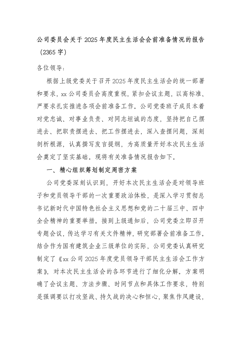 公司委员会关于2025年度民主生活会会前准备情况的报告(2365字)各位领导:根据上级党委关于召开2025年度民主生活会的统一部署和要求,x公司委员会高度重视,紧扣会议主题,以高标准、严要求扎实推进各项会前准备工作。公司党委班子成员本着对党忠诚、对事业负责、对同志坦诚的态度,坚持把自己摆进去、把职责摆进去、把工作摆进去,深入查摆问题,深刻剖析根源,认真撰写发言提纲,为高质量开好本次民主生活会奠定了坚实基础。现将有关准备情况报告如下。一、精心组织筹划制定周密方案公司党委深刻认识到,开好本次民主生活会是对领导班子和党员领导干部的一次重要政治体检,是深入学习贯彻总书记新时代中国特色社会主义思想和党的二十届三中、四中全会精神的重要举措。接到上级通知后,公司党委立即召开专题会议,传达学习有关文件精神,研究部署会前准备工作。结合作为国有建筑企业三级单位的实际,公司党委认真研究制定了《x双公司2025年度党员领导干部民主生活会工作方案》,对本次民主生活会的各环节进行了细化分解。方案明确了会议主题、方法步骤、时间节点和具体工作要求,特别是强调要以打攻坚战、持久战的决心和恒心,聚焦作风建设,为实现“十五五”良好开局凝心聚力。方案的制定与执行,为开好此次民主生活会提供了有力的组织保障和清晰的路径指引。二、深化理论武装筑牢思想根基公司党委始终把理论学习作为开好民主生活会的首要环节和思想基础,坚持读原著、学原文、悟原理,组织班子成员深入开展理论学习。学习采取集体研讨与个人自学相结合的方式确保学深悟透、融会贯通。在2025年12月下旬,公司党委书记主持召开了会前理论学习中心组集体学习研讨会。会上,班子成员集中学习了总书记新时代中国特色社会主义思想,全面系统学习了党的二十届三中、四中全会精神,深入学习领会了总书记总书记关于党的建设的重要思想、关于党的自我革命的重要思想,以及对国有企业改革发展和建筑行业的重要指示批示精神。同时,班子成员还重温了党章、《关于新形势下党内政治生活的若干准则》、《中国共产党纪律处分条例》等党内法规。通过系统深入的学习,班子成员进一步深化了对“两个确立”决定性意义的认识,增强了“四个意识”坚定了“四个自信”做到了“两个维护”切实把思想和行动统一到党中央决策部署上来,为开好民主生活会、开展批评和自我批评打下了坚实的思想理论基础。三、广开言路纳谏深入查摆问题为确保问题查摆得准、找得实、挖得深,公司党委坚持开门纳谏,发扬民主,通过