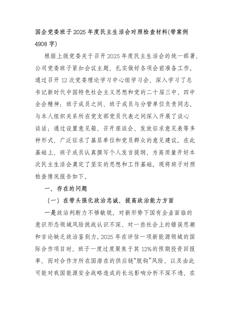 国企党委班子2025年度民主生活会对照检查材料(带案例4908字)根据上级党委关于召开2025年度民主生活会的统一部署,公司党委班子紧扣会议主题,扎实做好各项会前准备工作。通过召开12次党委理论学习中心组学习会,深入学习了总书记新时代中国特色社会主义思想和党的二十届三中、四中全会精神;班子成员之间、班子成员与分管单位负责同志、与本人组织关系所在党支部党员代表之间深入开展了谈心谈话;通过设置意见箱、召开座谈会、发放征求意见表等多种形式,广泛征求了基层单位和党员群众的意见建议。在此基础上,班子成员认真撰写个人发言提纲,为高质量开好本次民主生活会奠定了坚实的思想和工作基础。现将班子对照检查情况报告如下。一、存在的问题(一)在带头强化政治忠诚、提高政治能力方面一是政治判断力不够敏锐。对新形势下国有企业面临的意识形态领域风险挑战认识不深,对一些社会上的错误思潮和言论缺乏政治鉴别力。2025年在评估一项新能源领域的国际合作项目时,班子一度过度聚焦于其12%的预期投资回报率,而对合作方所在国潜在的供应链“脱钩”风险、以及由此可能对我国能源安全战略造成的长远影响分析不深不透,在省国资委后续的风险提示下才进行了方案调整,反映出从政治高度审视经济问题的能力存在短板。二是政治领悟力不够深刻。对党中央的决策部署有时存在理解上的偏差,未能完全做到从全局和战略高度来把握。党的二十届四中全会提出要加快形成新质生产力,集团党委虽然组织了学习,但在推动传统基础设施板块数字化转型工作中,行动不够迅速,耗时六个月才出台具体实施方案,比行业内先进企业晚了一个季度。三是政治执行力不够坚决。在贯彻落实上级决策部署上,存在打折扣、搞变通的现象,缺乏一抓到底的韧劲。例如,在落实安全生产责任制过程中,虽然层层签订了责任状,但在实际工作中,对个别下属单位出现的安全隐患整改不力问题,处理不够果断。(二)在带头固本培元、增强党性方面一是理论学习不求甚解。党委理论学习中心组虽然完成了年度学习计划,但学习的深度和系统性不够。2025年组织的12次集体学习中,有5次是以传达文件、布置工作代替深度研讨,班子成员间的思想碰撞不多。抽查部分班子成员的学习笔记,发现对“总书记新时代中国特色社会主义思想”核心要义的个人感悟和思考性内容占比不高,大多是对原文的简单摘抄,理论学习往深里走、往实里走、往心里走的成效不彰。二是党性锤炼不够自觉。在日常工作中,过多地把自