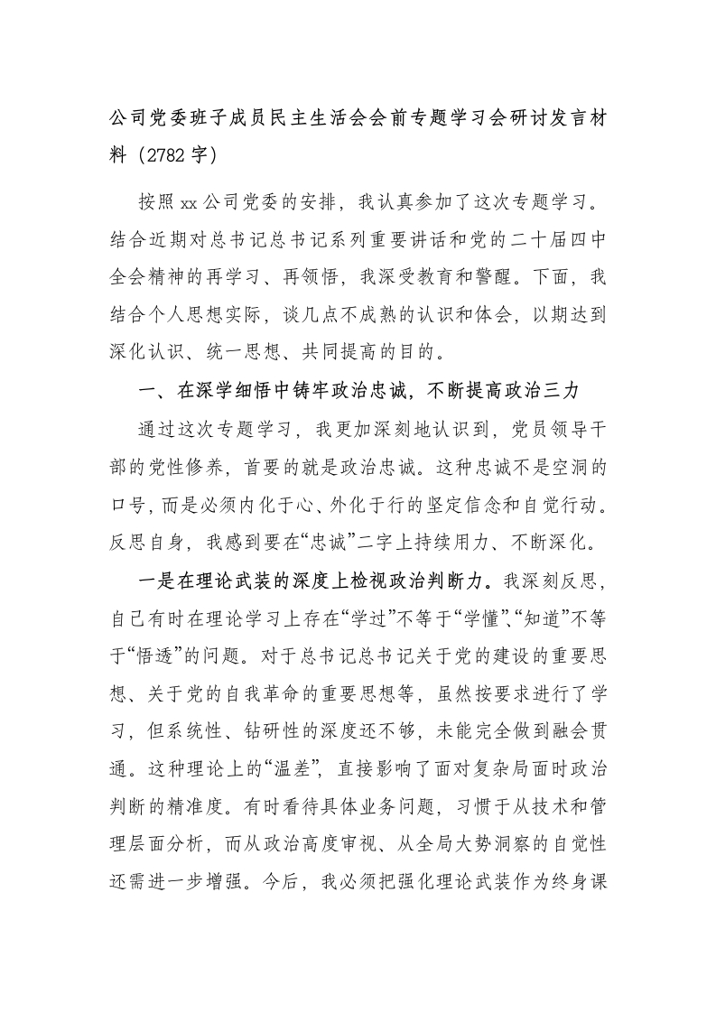 公司党委班子成员民主生活会会前专题学习会研讨发言材料(2782字)按照x双公司党委的安排,我认真参加了这次专题学习。结合近期对总书记总书记系列重要讲话和党的二十届四中全会精神的再学习、再领悟,我深受教育和警醒。下面,我结合个人思想实际,谈几点不成熟的认识和体会,以期达到深化认识、统一思想、共同提高的目的。一、在深学细悟中铸牢政治忠诚,不断提高政治三力通过这次专题学习,我更加深刻地认识到,党员领导干部的党性修养,首要的就是政治忠诚。这种忠诚不是空洞的口号,而是必须内化于心、外化于行的坚定信念和自觉行动。反思自身,我感到要在“忠诚”二字上持续用力、不断深化。一是在理论武装的深度上检视政治判断力。我深刻反思,自己有时在理论学习上存在“学过”不等于“学懂”“知道”不等于“悟透”的问题。对于总书记总书记关于党的建设的重要思想、关于党的自我革命的重要思想等,虽然按要求进行了学习,但系统性、钻研性的深度还不够,未能完全做到融会贯通。这种理论上的“温差”,直接影响了面对复杂局面时政治判断的精准度。有时看待具体业务问题,习惯于从技术和管理层面分析,而从政治高度审视、从全局大势洞察的自觉性还需进一步增强。今后,我必须把强化理论武装作为终身课题,下苦功夫、真功夫,真正把“两个确立”的决定性意义和“两个维护”的实践要求,从思想深处转化为坚定的政治信仰和行动自觉。二是在站位格局的高度上检视政治领悟力。学习《中共中央关于制定国民经济和社会发展第十五个五年规划的建议》等重要文件时,我认识到,每一项国家战略、每一个发展目标,背后都蕴含着党中央深邃的政治考量和战略擘画。对照反思,我在将中央精神与公司实际相结合的过程中,有时领悟得还不够透彻。比如,在思考如何推进x公司高质量发展时,可能更多地聚焦于具体的生产经营指标,而对于如何更好地服务国家能源安全战略、如何在区域经济发展中体现国企担当等宏大叙事,思考的深度和广度还显不足。这说明我的政治领悟力仍有提升空间。我必须持续提升自已的站位格局,善于从党和国家事业全局的高度来思考和谋划工作,确保公司的各项决策部署始终与党中央的要求同频共振。三是在贯彻执行的力度上检视政治执行力。对党忠诚,最终要体现在不折不扣的贯彻执行上。自我检视,我在执行决策部署上总体是坚决的,但有时面对一些周期长、见效慢的硬任务,比如主要领导同志反复强调的建设特色产品基地、抓实精益管理等中心工作,偶尔会产生畏难情绪和“等一等、看一看”的想法,缺乏“一竿子插到底”的韧劲和狠劲。这种执行上的折扣,归根结底是政治执行力不够强的表现。我必须