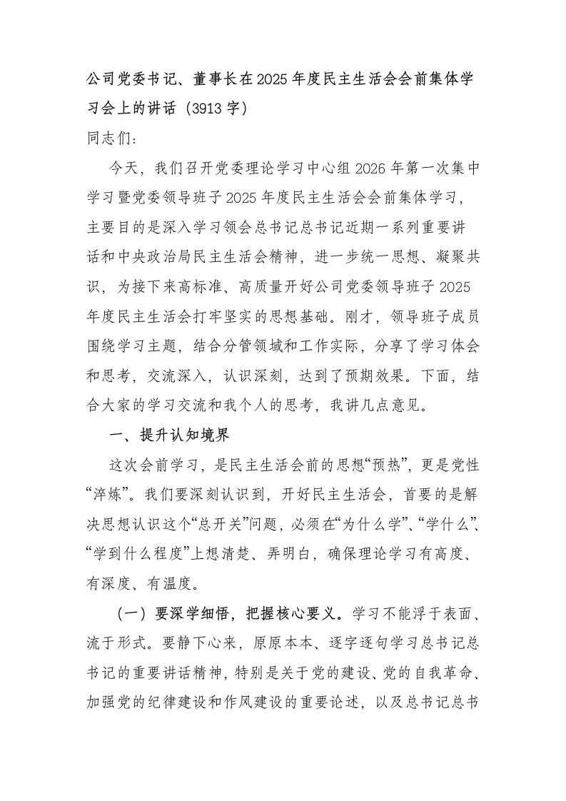 公司党委书记、董事长在2025年度民主生活会会前集体学习会上的讲话(3913字)同志们:今天,我们召开党委理论学习中心组2026年第一次集中学习暨党委领导班子2025年度民主生活会会前集体学习,主要目的是深入学习领会总书记总书记近期一系列重要讲话和中央政治局民主生活会精神,进一步统一思想、凝聚共识,为接下来高标准、高质量开好公司党委领导班子2025年度民主生活会打牢坚实的思想基础。刚才,领导班子成员围绕学习主题,结合分管领域和工作实际,分享了学习体会和思考,交流深入,认识深刻,达到了预期效果。下面,结合大家的学习交流和我个人的思考,我讲几点意见。一、提升认知境界这次会前学习,是民主生活会前的思想“预热”,更是党性“淬炼”。我们要深刻认识到,开好民主生活会,首要的是解决思想认识这个“总开关”问题,必须在“为什么学”、“学什么”“学到什么程度”上想清楚、弄明白,确保理论学习有高度、有深度、有温度。(一)要深学细悟,把握核心要义。学习不能浮于表面、流于形式。要静下心来,原原本本、逐字逐句学习总书记总书记的重要讲话精神,特别是关于党的建设、党的自我革命、加强党的纪律建设和作风建设的重要论述,以及总书记总书记在二十届中央政治局第二十一次集体学习、对深入贯彻中央八项规定精神学习教育的重要指示和中央纪委五次全会上的重要讲话精神。要深刻理解其中蕴含的马克思主义立场、观点、方法,把握其精神实质和核心要义,不能停留在读过了、学过了的层面,而要真正内化于心,做到融会贯通。就像磨刀一样,理论学习不磨到一定程度,刀刃就不会锋利,就难以在查摆问题、开展批评时切中要害、触及灵魂。(二)要融会贯通,形成系统思维。总书记新时代中国特色社会主义思想是一个系统完整、逻辑严密的科学体系。学习不能碎片化、孤立化。要把今天学习的内容,同党的二十大和二十届历次全会精神结合起来,同总书记总书记考察云南重要讲话精神等贯通起来,放在新时代党和国家事业发展全局中来理解,放在公司改革发展稳定的具体实践中来思考。要看到讲话要求之间的内在联系,比如,加强纪律建设与推进自我革命的关系,改进作风与担当作为的关系,从而形成一个全面的、系统的认识框架,避免“只见树木,不见森林”。这种系统性的把握,能帮助我们更精准地定位自身存在的问题,看清问题背后的深层次原因。(三)要对标对表,校正思想偏差。学习的最终目的是为了应用,为了改造主观世界和客观世界。我们要以中央政治局民主生活会为标杆,自觉向党中央看齐,向党的理论和路线方针政策看齐,向党中央决策部署看齐。要经常用总书
