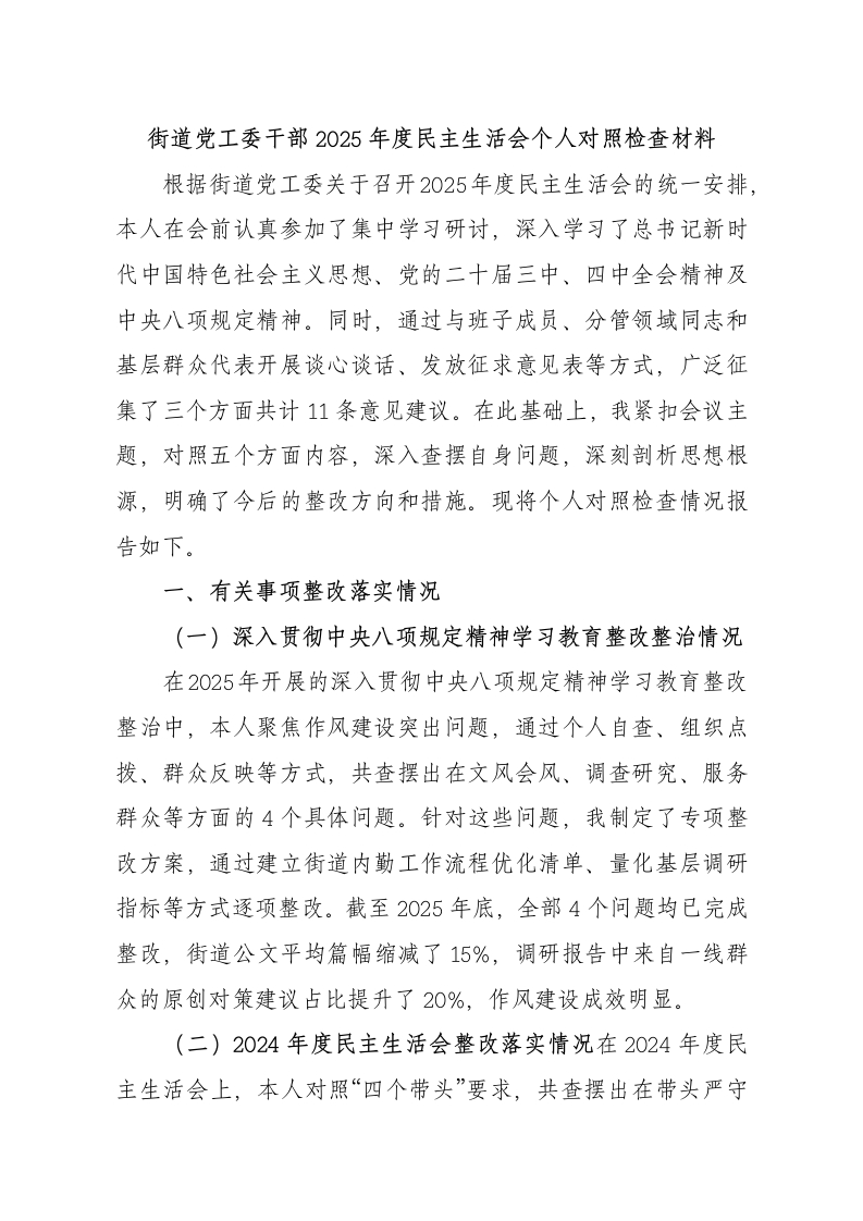 街道党工委干部2025年度民主生活会个人对照检查材料根据街道党工委关于召开2025年度民主生活会的统一安排,本人在会前认真参加了集中学习研讨,深入学习了总书记新时代中国特色社会主义思想、党的二十届三中、四中全会精神及中央八项规定精神。同时,通过与班子成员、分管领域同志和基层群众代表开展谈心谈话、发放征求意见表等方式,广泛征集了三个方面共计11条意见建议。在此基础上,我紧扣会议主题,对照五个方面内容,深入查摆自身问题,深刻剖析思想根源,明确了今后的整改方向和措施。现将个人对照检查情况报告如下。一、有关事项整改落实情况(一)深入贯彻中央八项规定精神学习教育整改整治情况在2025年开展的深入贯彻中央八项规定精神学习教育整改整治中,本人聚焦作风建设突出问题,通过个人自查、组织点拨、群众反映等方式,共查摆出在文风会风、调查研究、服务群众等方面的4个具体问题。针对这些问题,我制定了专项整改方案,通过建立街道内勤工作流程优化清单、量化基层调研指标等方式逐项整改。截至2025年底,全部4个问题均已完成整改,街道公文平均篇幅缩减了15%,调研报告中来自一线群众的原创对策建议占比提升了20%,作风建设成效明显。(二)2024年度民主生活会整改落实情况在2024年度民主生活会上,本人对照“四个带头”要求,共查摆出在带头严守政治纪律、带头增强党性、带头勇于担责、带头履行管党治党责任等4个方面存在的5个问题。会后,我逐一制定了整改措施,明确了完成时限。一年来,通过坚持参加第一议题学习、主动牵头难点工作、定期开展廉政谈话等方式,扎实推进整改。截至2025年11月底,所查摆的5个问题已全部整改完毕,整改完成率达到100%,长期坚持的整改措施也已转化为工作习惯和制度规范。(三)有关专题民主生活会整改落实情况本人2025年度未参加其他专题民主生活会,无相关整改事项。二、存在的问题本人严格对照“带头强化政治忠诚、提高政治能力”“带头固本培元、增强党性“带头敬畏人民、敬畏组织、敬畏法纪“带头干事创业、担当作为“带头坚决扛起管党治党责任”等5个方面,深入查摆自身存在的突出问题。(一)在带头强化政治忠诚、提高政治能力方面一是贯彻上级决策部署存在“温差”。在执行上级关于残疾人事业高质量发展的决策部署时,有时将工作重心过多地放在完成具体指标任务上,例如按时发放了多少笔康复补贴、改造了多少户无障碍设施,但对政策背后蕴含的推动残疾人全面发展和共同富裕的战略考量领悟不深,导致工作有时停留在“机械执行”层面,缺乏结合街道实际进行创造性转化的主动性,使得