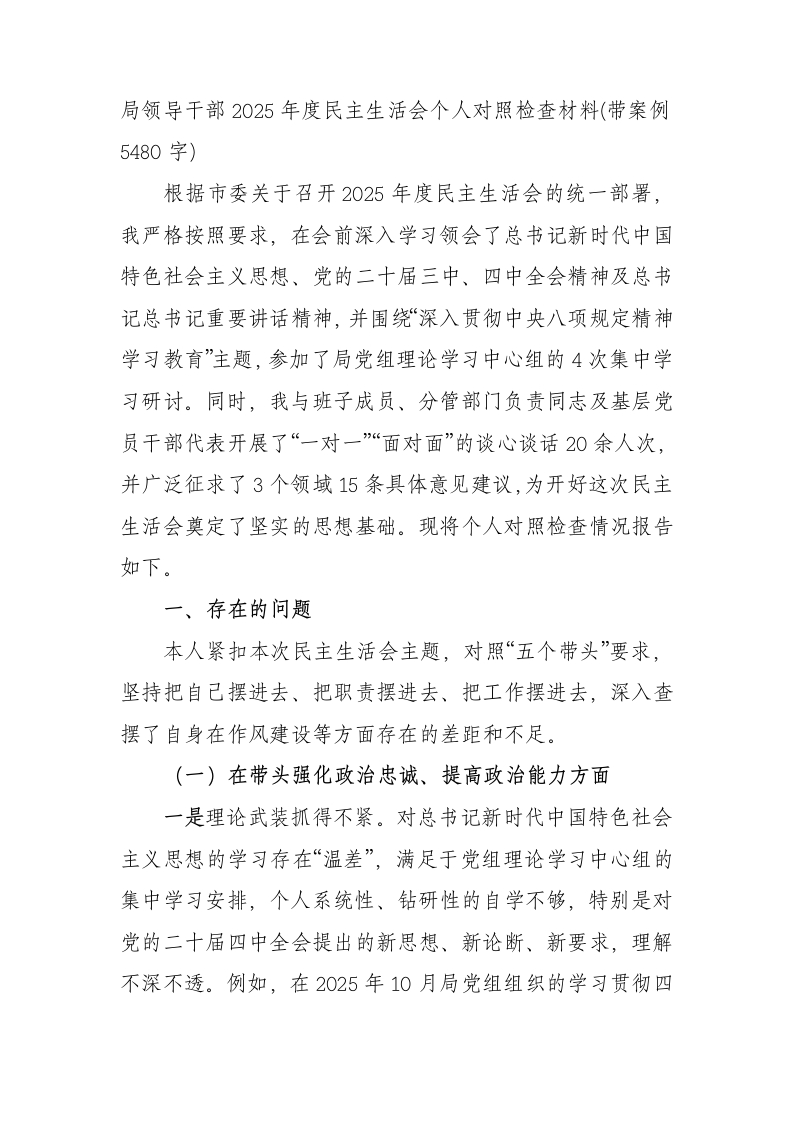 局领导干部2025年度民主生活会个人对照检查材料(带案例5480字)根据市委关于召开2025年度民主生活会的统一部署,我严格按照要求,在会前深入学习领会了总书记新时代中国特色社会主义思想、党的二十届三中、四中全会精神及总书记总书记重要讲话精神,并围绕“深入贯彻中央八项规定精神学习教育”主题,参加了局党组理论学习中心组的4次集中学习研讨。同时,我与班子成员、分管部门负责同志及基层党员干部代表开展了“一对一”“面对面”的谈心谈话20余人次,并广泛征求了3个领域15条具体意见建议,为开好这次民主生活会奠定了坚实的思想基础。现将个人对照检查情况报告如下。一、存在的问题本人紧扣本次民主生活会主题,对照“五个带头”要求,坚持把自己摆进去、把职责摆进去、把工作摆进去,深入查摆了自身在作风建设等方面存在的差距和不足。(一)在带头强化政治忠诚、提高政治能力方面一是理论武装抓得不紧。对总书记新时代中国特色社会主义思想的学习存在“温差”,满足于党组理论学习中心组的集中学习安排,个人系统性、钻研性的自学不够,特别是对党的二十届四中全会提出的新思想、新论断、新要求,理解不深不透。例如,在2025年10月局党组组织的学习贯彻四中全会精神专题研讨会上,我的发言更多是复述理论观点,未能紧密结合我局承担的全市“十五五”规划前期研究课题,提出有深度、有分量的贯彻落实思路。二是政治判断悟得不透。在纷繁复杂的形势变化面前,有时未能完全做到从政治高度观察、分析和处理问题。在推进我局2025年重点工作任务清单中的“城市大脑”二期项目时,我一度将之单纯视为技术升级项目,在初期论证阶段仅邀请了技术专家和企业参与,忽视了其在提升城市治理能力、维护意识形态安全方面的政治属性,直到市委领导在专题调研中点出这一问题,我才意识到政治站位不高,未能从全局和战略高度把握工作方向。三是决策执行跟得不实。对中央和自治区党委的决策部署,虽然能够做到闻令而动,但在具体执行过程中,存在抓落实“最后一公里”韧劲不足的问题。2025年,市委明确要求各单位在第三季度前完成对下属事业单位的职能优化整合。我分管的两个事业单位,由于涉及人员编制调整和资产划转等复杂问题,我产生了畏难情绪,工作推进缓慢,直到11月底才提交初步方案,比市委要求时限晚了近两个月,影响了全市事业单位分类改革的整体进度。(二)在带头固本培元、增强党性方面一是党性锤炼有所松劲。随着工作年限的增加和职务的提升,自我感觉党性修养有了一定基础,在持续“补钙壮骨”上产生了懈怠思想。参加组织生活的标准有所降低,满足于