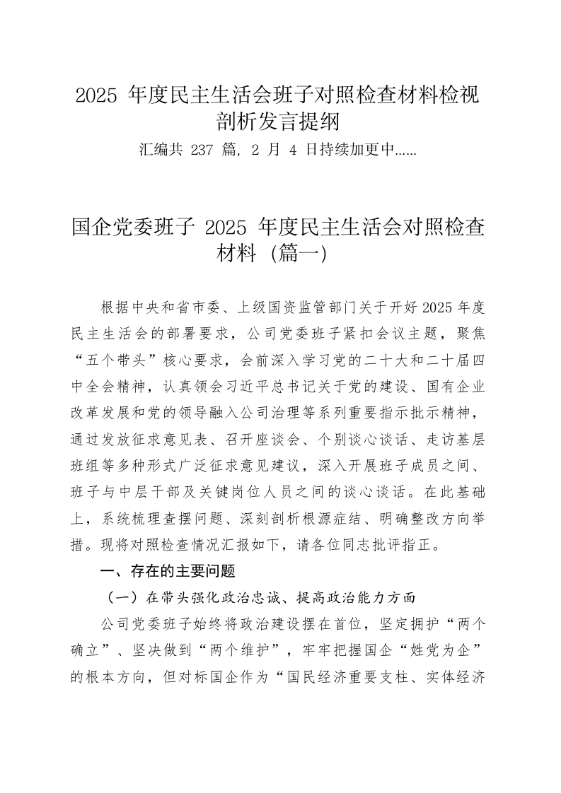 【237篇民主生活会班子】2025年度民主生活会班子对照检查材料检视剖析发言提纲(领导班子,党委党支部党组、市委县委区委政府机关单位、集团国企办公室局,五个带头方面六个对照等)