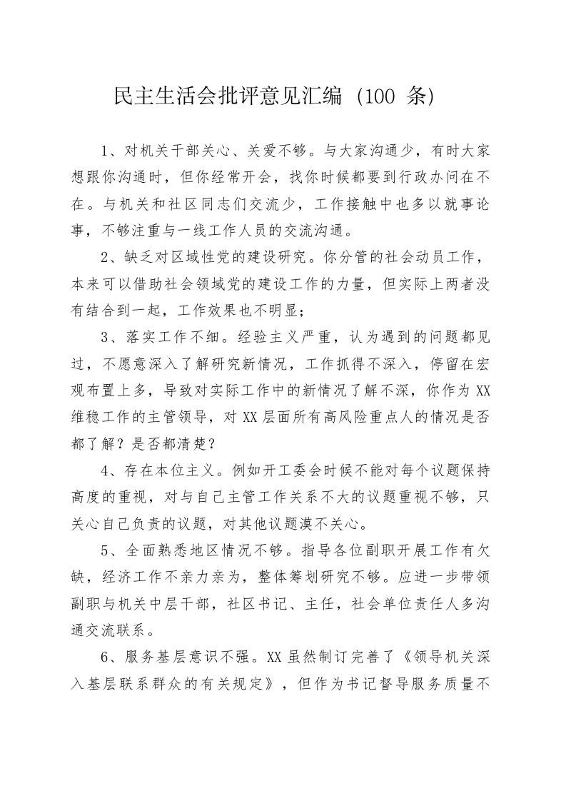 民主生活会批评意见汇编(100条)1、对机关干部关心、关爱不够。与大家沟通少,有时大家想跟你沟通时,但你经常开会,找你时候都要到行政办问在不在。与机关和社区同志们交流少,工作接触中也多以就事论事,不够注重与一线工作人员的交流沟通。2、缺乏对区域性党的建设研究。你分管的社会动员工作,本来可以借助社会领域党的建设工作的力量,但实际上两者没有结合到一起,工作效果也不明显;3、落实工作不细。经验主义严重,认为遇到的问题都见过,不愿意深入了解研究新情况,工作抓得不深入,停留在宏观布置上多,导致对实际工作中的新情况了解不深,你作为XX维稳工作的主管领导,对XX层面所有高风险重点人的情况是否都了解?是否都清楚?4、存在本位主义。例如开工委会时候不能对每个议题保持高度的重视,对与自己主管工作关系不大的议题重视不够,只关心自己负责的议题,对其他议题漠不关心。5、全面熟悉地区情况不够。指导各位副职开展工作有欠缺,经济工作不亲力亲为,整体筹划研究不够。应进一步带领副职与机关中层干部,社区书记、主任,社会单位责任人多沟通交流联系。6、服务基层意识不强。XX虽然制订完善了《领导机关深入基层联系群众的有关规定》,但作为书记督导服务质量不够,领导机关虽然下基层了,但是不注重效果,没有定期通报和交流,没有认真地进行督促检查和落实,这是形式主义的具体表现。7、不重视纪检监察制度建设。作为纪工委书记,对于如何预防腐败,如何改进作风等问题缺少务实管用的长效化措施,具体表现为对机关政风行风方面存在的问题没有及时补漏和建立监督检查制度办法,以至于监督检查工作处在停滞不前的状态。8、进取精神不够。工作主动性、积极性不强,工作热情和工作劲头有些消减。满足于完成工作,工作中有畏难情绪,如对经济工作,虽然指标工作重,但是从一开始就缺乏完成工作指标的信心,在落实过程中计划性不强,造成一段时间内有工作忙乱的现象。9、存在“老好人”思想。具体表现为对行政执法部门在重要节日、易滋生贪腐机会的时段,没能做到及早提醒,早预防,早发现,批评教育多,实际措施少,没有形成真正的震慑。10、XX同志作为单位一把手,往往只过多注重业务工作,对上级部署的各种学习教育活动,统筹不好,力度不大,虽然也提出了一些见缝插针、灵活安排的措施,但推进力度不大,效果不明显。同时,没有真正做到“从群众中来,到群众中去”。在日常工作、学习和生活中,有时还存在“领导要有领
