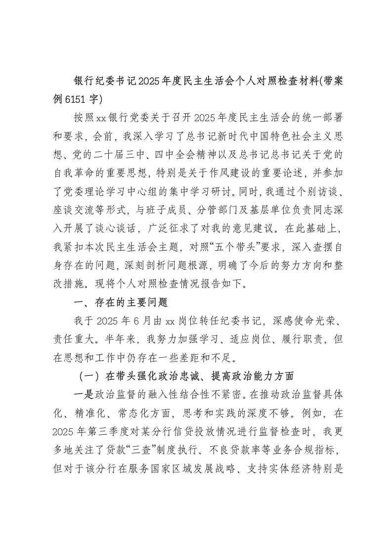 银行纪委书记2025年度民主生活会个人对照检查材料(带案例6151字)按照xx银行党委关于召开2025年度民主生活会的统一部署和要求,会前,我深入学习了总书记新时代中国特色社会主义思想、党的二十届三中、四中全会精神以及总书记总书记关于党的自我革命的重要思想,特别是关于作风建设的重要论述,并参加了党委理论学习中心组的集中学习研讨。同时,我通过个别访谈、座谈交流等形式,与班子成员、分管部门及基层单位负责同志深入开展了谈心谈话,广泛征求了对我的意见建议。在此基础上,我紧扣本次民主生活会主题,对照“五个带头”要求,深入查摆自身存在的问题,深刻剖析问题根源,明确了今后的努力方向和整改措施。现将个人对照检查情况报告如下。一、存在的主要问题我于2025年6月由xx岗位转任纪委书记,深感使命光荣、责任重大。半年来,我努力加强学习、适应岗位、履行职责,但在思想和工作中仍存在一些差距和不足。(一)在带头强化政治忠诚、提高政治能力方面一是政治监督的融入性结合性不紧密。在推动政治监督具体化、精准化、常态化方面,思考和实践的深度不够。例如,在2025年第三季度对某分行信贷投放情况进行监督检查时,我更多地关注了贷款“三查”制度执行、不良贷款率等业务合规指标,但对于该分行在服务国家区域发展战略、支持实体经济特别是“十五五规划开局重点项目方面的政治站位高不高、行动快不快、措施实不实等问题,挖掘不深、研判不透,未能完全将政治监督嵌入业务发展的全过程,从政治高度审视业务问题的能力不强。二是贯彻决策部署的穿透力执行力不彻底。对党中央的决策部署和上级党委的工作要求,虽然能够做到闻令而动、坚决执行,但在推动政策要求直达基层、末端落实上,力度有所衰减。2025年下半年,总行部署开展防范化解金融风险专项整治行动,我牵头制定了监督方案,也组织了多次督导检查,但更多采取听取汇报、查阅台账的方式,对一些风险隐患较为集中的基层网点,未能做到“四不两直”式暗访,导致对基层存在的“报喜不报忧”、风险处置“上热下冷”等情况掌握不全面,监督的“探头”作用发挥不充分。三是应对风险挑战的敏锐性前瞻性不敏锐。身处金融领域,对经济形势变化可能引发的金融风险,特别是廉洁风险的复杂性和严峻性,认识和准备不充足。比如,面对数字化转型加速,线上业务、供应链金融等新型业务模式不断涌现,我对其中可能潜藏的利用数据权限谋私、内外勾结等新型腐败和作风问题,缺乏系统性研究和预判,未能及时推动建立健全前瞻性的廉洁风险防控机制,在增强忧患意识、坚持底线思维上做得不扎实。(二)在带头固本培元、增强党性方面一是理论学习的主动性系统性不深入。日常更多地是通过参加党委中心组学习、阅读文件简报等方式进行学习,个人静下心
