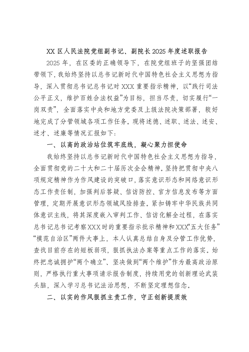 X区人民法院党组副书记、副院长2025年度述职报告2025年,在区委的正确领导下,在院党组班子的坚强团结带领下,我始终坚持以总书记新时代中国特色社会主义思想为指导,深入贯彻总书记总书记对XX重要指示精神,以“践行司法公平正义,维护百姓合法权益”为目标,担当尽责,切实履行“一岗双责”,全面落实中央和地方党委及上级法院决策部署,较好地完成了分管领域各项工作任务。现将述德、述职、述法、述安、述才、述廉等情况汇报如下:一、以高的政治站位筑牢底线,凝心聚力担使命我始终坚持以总书记新时代中国特色社会主义思想为指导,全面贯彻党的二十大和二十届历次全会精神。坚持把贯彻中央八项规定精神作为作风建设的突破口,落实意识形态和网络意识形态工作责任制,加强判后答疑、信访防控、官方信息发布等方面管理,定期开展意识形态领域风险排查。紧扣铸牢中华民族共同体意识主线,将其深度嵌入审判工作、信访化解全过程,在落实总书记总书记考察XXX时的重要指示批示精神和XXX“五大任务”“模范自治区”两件大事上,本人认真总结自身及分管工作优势,查找目前存在的短板弱项,狠抓执法办案等重点工作的落实。始终把忠诚拥护“两个确立”、坚决做到“两个维护”作为最高政治原则,严格执行重大事项请示报告制度,持续用党的创新理论武装头脑,深入学习总书记法治思想,不断坚定理想信念。二、以实的作风狠抓主责工作,守正创新提质效按照院党组分工,本人目前分管综合办公室、刑事审判庭、信访室等。现将工作开展情况汇报如下:一是刑事审判质效稳步提升。截止2025年12月31日,受理刑事案件861件审结822件,结案率95.47%。依法审理危险驾驶、交通肇事等危害公共安全犯罪案件380件391人;审结涉电信网络诈骗案件120件;审结故意伤害、强奸等严重暴力犯罪案件32件35人;审结抢劫、抢夺、盗窃等多发性侵犯财产犯罪案件80件101人;审结贩卖毒品等涉毒犯罪22件27人;审结赌博案件11件39余人;审结寻衅滋事、妨害公务等妨害社会管理秩序犯罪案8件17人。审结破坏社会主义市场经济秩序罪25件,主要包括生产、销售有毒、有害食品罪4件14人,合同诈骗罪8件10人。认真开展未成年人刑事审判工作,始终坚持“教育、感化、挽救”的基本方针和“教育为主、惩罚为辅”的原则,全年共计审结未成年人犯罪案件31件43人,开展校园宣讲活动2次,模拟法庭活动2次。常态化开展扫黑除恶斗争工作,对近年以来涉及重点行业领域的违法犯罪案件进行“回头看”,对所办理的违法犯罪案件进行全面梳理分析,重点对涉煤领域、非法采砂等案件重新进行分析研判,深挖彻查,现暂未发现扫黑除恶相关线索。二是信访工作法治化推进有力。按照上级法院的要求推进“有信必复”工作的开展,全年共计受理各个渠道有信必复信访案件266件,办结177件,化解22件。中央第十巡视组进驻自治区巡视