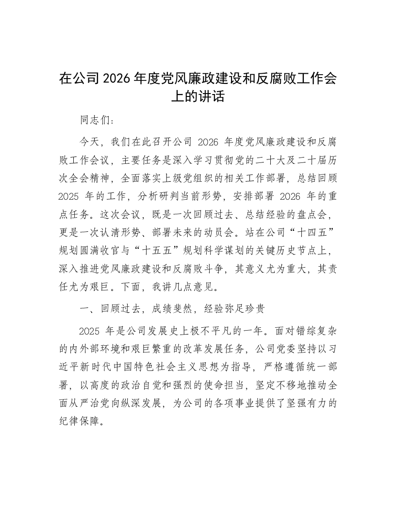 在公司2026年度党风廉政建设和反腐败工作会上的讲话同志们:今天,我们在此召开公司2026年度党风廉政建设和反腐败工作会议,主要任务是深入学习贯彻党的二十大及二十届历次全会精神,全面落实上级党组织的相关工作部署,总结回顾2025年的工作,分析研判当前形势,安排部署2026年的重点任务。这次会议,既是一次回顾过去、总结经验的盘点会,更是一次认清形势、部署未来的动员会。站在公司“十四五”规划圆满收官与“十五五”规划科学谋划的关键历史节点上,深入推进党风廉政建设和反腐败斗争,其意义尤为重大,其责任尤为艰巨。下面,我讲几点意见。一、回顾过去,成绩斐然,经验弥足珍贵2025年是公司发展史上极不平凡的一年。面对错综复杂的内外部环境和艰巨繁重的改革发展任务,公司党委坚持以习近平新时代中国特色社会主义思想为指导,严格遵循统一部署,以高度的政治自觉和强烈的使命担当,坚定不移地推动全面从严治党向纵深发展,为公司的各项事业提供了坚强有力的纪律保障。过去的一年,公司在强化理论武装上持续用力,坚持不懈用新时代中国特色社会主义思想凝心铸魂。通过党委理论学习中心组、专题读书班、主题党日等多种形式,组织广大党员干部深入学习党的创新理论,深刻领悟“两个确立”的决定性意义,增强“四个意识”、坚定“四个自信”、做到“两个维护”。思想的航标更加清晰,行动的自觉性显著增强。过去的一年,公司在深化政治监督上精准发力,确保了党中央及上级党组织的决策部署在公司不折不扣地落地生根。监督工作紧紧围绕公司天然铀高质量发展、深化改革、安全生产等核心任务展开,通过专项督查、日常监督、政治巡察等方式,推动各级党组织和领导干部履职尽责,确保了公司战略方向不偏航、发展步调不紊乱。过去的一年,公司在健全监督体系上协力并进,推动了各类监督贯通协调、形成合力。纪检、巡察、审计、财务、法务等监督力量的协同效能进一步提升,构建了横向到边、纵向到底的监督网络。一体推进“三不腐”机制建设取得新成效,通过强化警示教育筑牢“不想腐”的堤坝,通过扎紧制度笼子巩固“不能腐”的防线,通过保持高压态势强化“不敢腐”的震慑。过去的一年,公司在深化作风建设上常抓不懈,锲而不舍落实中央八项规定精神。坚决向形式主义、官僚主义“亮剑”,大力整治文山会海、过度留痕等顽瘴痼疾,切实为基层