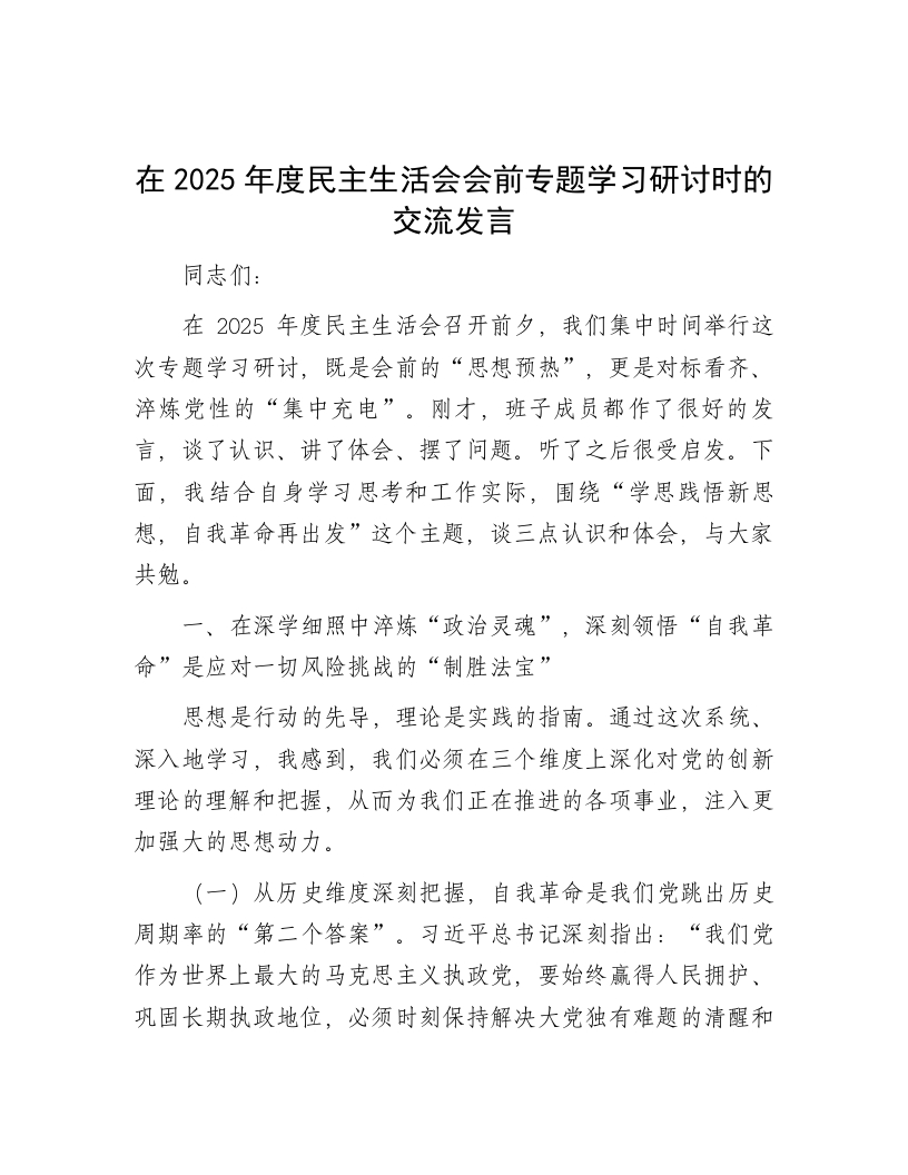 在2025年度民主生活会会前专题学习研讨时的交流发言同志们:在2025年度民主生活会召开前夕,我们集中时间举行这次专题学习研讨,既是会前的“思想预热”,更是对标看齐、淬炼党性的“集中充电”。刚才,班子成员都作了很好的发言,谈了认识、讲了体会、摆了问题。听了之后很受启发。下面,我结合自身学习思考和工作实际,围绕“学思践悟新思想,自我革命再出发”这个主题,谈三点认识和体会,与大家共勉。一、在深学细照中淬炼“政治灵魂”,深刻领悟“自我革命”是应对一切风险挑战的“制胜法宝”思想是行动的先导,理论是实践的指南。通过这次系统、深入地学习,我感到,我们必须在三个维度上深化对党的创新理论的理解和把握,从而为我们正在推进的各项事业,注入更加强大的思想动力。(一)从历史维度深刻把握,自我革命是我们党跳出历史周期率的“第二个答案”。习近平总书记深刻指出:“我们党作为世界上最大的马克思主义执政党,要始终赢得人民拥护、巩固长期执政地位,必须时刻保持解决大党独有难题的清醒和坚定。”这部《习近平谈治国理政》第五卷,通篇贯穿着对这一重大课题的深邃思考。回望百年征程,我们党从小到大、由弱到强,历经无数惊涛骇浪而始终立于不败之地,靠的正是勇于自我革命这一最鲜明的品格。从延安整风到改革开放,再到新时代波澜壮阔的反腐败斗争,每一次刀刃向内,都带来了一次党的事业的伟大飞跃。对于我们乡镇一级而言,我们是国家治理体系的“神经未梢”,是党联系服务群众的“最后一公里”。我们是否具备自我革命的勇气,直接关系到党的执政根基是否牢固。我们不能认为自我革命是高层的事情,离我们很远。恰恰相反,群众身边的不正之风和腐败问题,对党的形象的损害更为直接。一个项目审批的“吃拿卡要”,一次矛盾纠纷的“推诿扯皮”,都可能侵蚀群众对党的信任。因此,我们必须把自我革命精神融入血脉,经常性地用“党章党规党纪”这把尺子量一量自己的言行,用群众的“口碑”这面镜子照一照自己的形象。(二)从理论维度深刻把握,党的二十届四中全会精神是推进基层治理现代化的“行动纲领”。党的二十届四中全会,系统擘画了推进国家治理体系和治理能力现代化的宏伟蓝图。这绝不是一个空泛的理论概念,而是与我们乡镇工作息息相关、紧密相连的实践课题。推进基层治理现代化,核心就是要把党的全面领导贯穿到基层治理的全过程、各方面。这就要求我们必须在自我革命中,不断革除那些不适应新时代要求的思