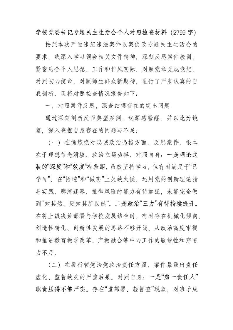 学校党委书记专题民主生活会个人对照检查材料(2799字)按照本次严重违纪违法案件以案促改专题民主生活会的要求,我深入学习领会相关文件精神,深刻反思案件教训,紧密结合个人思想、工作和作风实际,对照党章党规党纪,对照初心使命,对照师生群众新期待,进行了严肃认真的自我剖析。现将对照检查情况报告如下:一、对照案件反思,深查细摆存在的突出问题通过深刻剖析反面典型案例,我深感警醒,并以此为镜鉴,深入查摆自身存在的问题与不足:(一)在锤炼绝对忠诚政治品格方面。反思案件,根本在于理想信念滑坡、政治立场动摇。对照自身:一是理论武装的“深度”和“效度”有差距。虽然坚持学习,但有时满足于“已学习”,在“悟透”和“做实”上欠缺火候,运用党的创新理论指导实践、廓清迷雾、抵御风险的能力有待加强,未能完全做到“知其然、更知其所以然”。二是政治“三力”有待持续提升。在将上级决策部署与学校发展结合时,有时存在机械化倾向,创造性转化、创新性发展的思路不够开阔,从政治高度审视和推进教育教学改革、产教融合等中心工作的敏锐性和穿透力不足。(二)在履行管党治党政治责任方面。案件暴露出责任虚化、监督缺失的严重后果。对照自身:一是“第一责任人”职责压得不够严实。存在“重部署、轻督查”现象,对班子成员“一岗双责”和基层党组织书记责任的日常提醒、压力传导不够常态、不够有力,对一些苗头性、倾向性问题“红脸出汗”不够及时、不够彻底。二是廉政风险防控的精准性有待加强。对学校招生录取、校企合作、项目招标、经费管理等重点领域和关键环节的风险研判不够动态、深入,防控措施的针对性和前瞻性不足,结合职业教育特点构建全链条监督体系的思考谋划不够系统。(三)在恪守清正廉洁政治本色方面。案件根源在于党性原则失守、廉洁底线崩溃。对照自身:一是抵制“四风”特别是形式主义、官僚主义的韧性需增强。有时存在“路径依赖”会议、文件虽精简但实效有待提高;深入教学科研一线、倾听师生真实声音的主动性有所减弱,解决师生“急难愁盼”问题的效率和质量有待提升。二是自我革命精神有所弱化。对自身要求有时不够严格,艰苦奋斗、勤俭办学的意识需要时刻绷紧,在社会交往、生活细节中防微杜渐的警惕性需进一步提高。(四)在强化担当作为政治使命方面。案件警示,不担当不作为同样是变相的腐败。对照自身:一是党建引领发展的“融合引擎”动力不足。虽然强调党建与业务结合,但在破解深层次矛盾、推动重大改革(如高水平专业群建设、技术技能创新服务平台打造)中,党建引领作用的机制化、项目化设计不够到位,党组织的战斗堡垒作用在攻坚克难中发挥