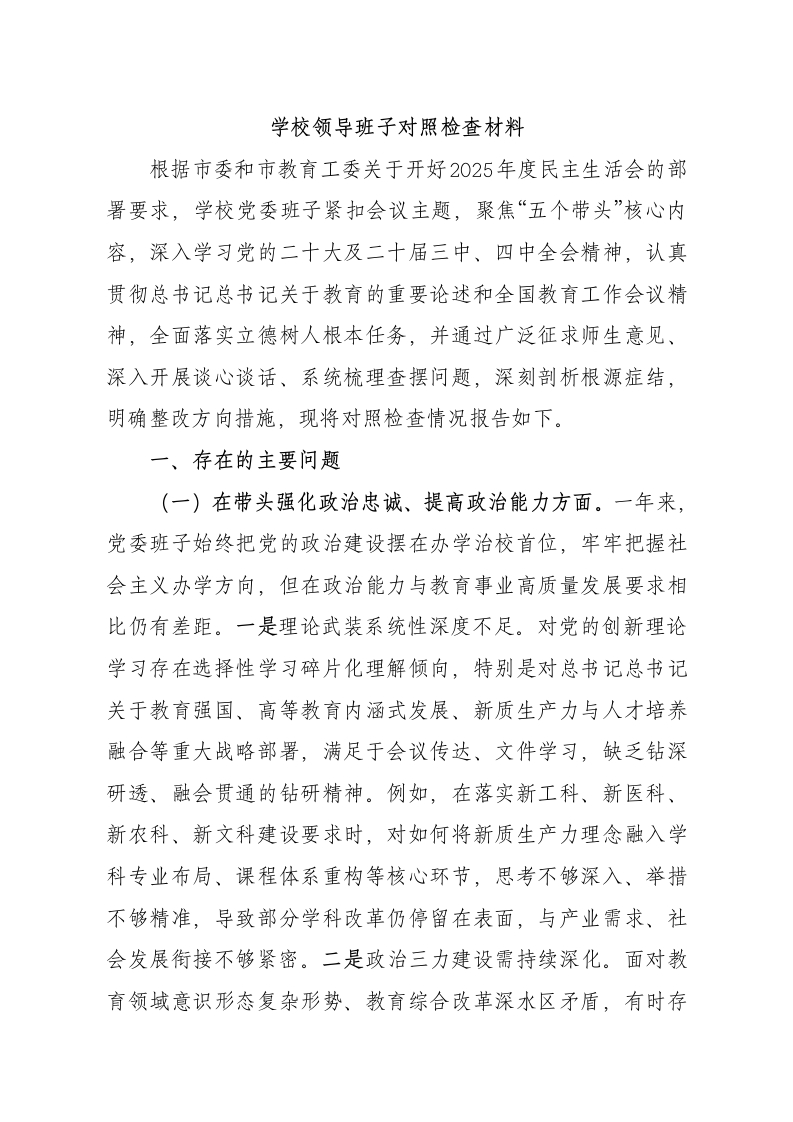 学校领导班子对照检查材料根据市委和市教育工委关于开好2025年度民主生活会的部署要求,学校党委班子紧扣会议主题,聚焦“五个带头”核心内容,深入学习党的二十大及二十届三中、四中全会精神,认真贯彻总书记总书记关于教育的重要论述和全国教育工作会议精神,全面落实立德树人根本任务,并通过广泛征求师生意见、深入开展谈心谈话、系统梳理查摆问题,深刻剖析根源症结,明确整改方向措施,现将对照检查情况报告如下。一、存在的主要问题(一)在带头强化政治忠诚、提高政治能力方面。一年来,党委班子始终把党的政治建设摆在办学治校首位,牢牢把握社会主义办学方向,但在政治能力与教育事业高质量发展要求相比仍有差距。一是理论武装系统性深度不足。对党的创新理论学习存在选择性学习碎片化理解倾向,特别是对总书记总书记关于教育强国、高等教育内涵式发展、新质生产力与人才培养融合等重大战略部署,满足于会议传达、文件学习,缺乏钻深研透、融会贯通的钻研精神。例如,在落实新工科、新医科、新农科、新文科建设要求时,对如何将新质生产力理念融入学科专业布局、课程体系重构等核心环节,思考不够深入、举措不够精准,导致部分学科改革仍停留在表面,与产业需求、社会发展衔接不够紧密。二是政治三力建设需持续深化。面对教育领域意识形态复杂形势、教育综合改革深水区矛盾,有时存在重业务轻政治的倾向,未能始终从政治高度审视教育教学、管理服务等各项工作。在贯彻落实党中央关于教育的决策部署时,虽能坚决执行,但结合学校实际创造性开展工作的能力不足,存在上下一般粗现象。如在推进双减政策延伸落实、校园安全稳定等工作中,照搬上级文件要求多,结合学校生源特点、办学特色的针对性措施少,工作实效未能达到预期。三是政治忠诚实践转化不够充分。将两个维护体现在办学治校全过程、各方面的力度不够,在把方向、管大局、作决策、抓班子、带队伍、保落实等职责履行中,政治引领作用发挥不够充分。例如,在加强意识形态阵地管理中,对课堂教学、学术讲座、网络空间等重点领域的政治把关不够严格,部分教师的课堂教学存在重知识传授、轻价值引领的倾向;在推动党建与教育教学深度融合上,思路不宽、办法不多,政治优势未能充分转化为办学优势。(二)在带头固本培元、增强党性方面。班子成员能够自觉参加党内政治生活,但在党性锻炼的经常性、严肃性、实效性上仍有欠缺。一是理想信念根基不够牢固。随着办学条件改善、工作环境优化,部分班子成员逐渐产生了求稳怕乱安于现状的思想,艰苦奋斗、攻坚克难的精气神有所减弱。面对教育改革发展中的硬骨头,如师资队伍结构优化、办学经费筹措等难题,缺乏逢山开路、遇水架桥的闯劲和韧劲。对社会上一些否定党的教育方针、歪曲教育公平的错误思潮,虽然能够做到