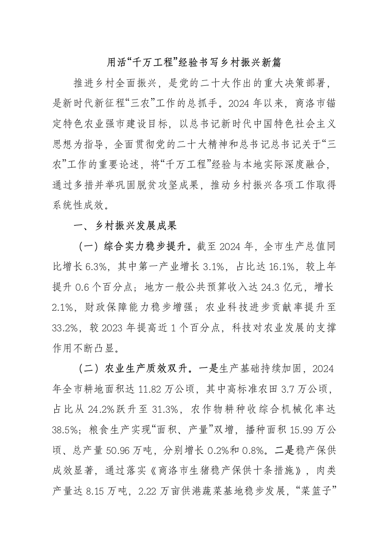 用活“千万工程”经验书写乡村振兴新篇推进乡村全面振兴,是党的二十大作出的重大决策部署,是新时代新征程“三农”工作的总抓手。2024年以来,商洛市锚定特色农业强市建设目标,以总书记新时代中国特色社会主义思想为指导,全面贯彻党的二十大精神和总书记总书记关于“三农”工作的重要论述,将“千万工程”经验与本地实际深度融合,通过多措并举巩固脱贫攻坚成果,推动乡村振兴各项工作取得系统性成效。一、乡村振兴发展成果(一)综合实力稳步提升。截至2024年,全市生产总值同比增长6.3%,其中第一产业增长3.1%,占比达16.1%,较上年提升0.6个百分点;地方一般公共预算收入达24.3亿元,增长2.1%,财政保障能力稳步增强;农业科技进步贡献率提升至33.2%,较2023年提高近1个百分点,科技对农业发展的支撑作用不断凸显。(二)农业生产质效双升。一是生产基础持续加固,2024年全市耕地面积达11.82万公顷,其中高标准农田3.7万公顷,占比从24.2%跃升至31.3%,农作物耕种收综合机械化率达38.5%;粮食生产实现“面积、产量”双增,播种面积15.99万公顷、总产量50.96万吨,分别增长0.2%和0.8%。二是稳产保供成效显著,通过落实《商洛市生猪稳产保供十条措施》,肉类产量达8.15万吨,2.22万亩供港蔬菜基地稳步发展,“菜篮子”考核获全省优秀。三是品牌建设亮点纷呈,“丹凤葡萄酒”获评“中华老字号”,“商洛香菇”“柞水木耳”分别拿下国内品牌商标和欧盟商标,品牌价值分别达30亿元、53.23亿元,全市绿色有机地理标志特优新农产品总量增至196个。(三)乡村环境宜业宜居。一是深入推进“千万工程”,启动建设市级重点村100个、秦岭山水乡村300个、和美镇区86个,成功承办全省相关工作推进会。二是人居环境显著改善,2024年农村自来水普及率94.8%、畜禽粪污利用率94.2%、生活污水治理管控率66.6%,较上年提升4.3个百分点;农村卫生厕所普及率达70.7%,提升2.3个百分点。三是基础设施日趋完善,通三级及以上公路乡镇占比84.7%,较大人口规模自然村通硬化公路比例为93.4%,行政村5G通达率89.7%,分别较上年提升1个、8.3个百分点,乡村生产生活便利性大幅提升。(四)乡风文明持续向好。一是农村公共文化服务体系不断健全,88.1%的村拥有体育健身场所,村综合文化服务中心覆盖率达92.8%,71.3%的村成立农民业余文化组织,文化惠民实效显著。二是精神文明建设深入推进,通过移风易俗、倡导文明新风,省级及以上文明村镇占比从2023年的20.4%提升至2024年的23.5%,农民精神风貌焕然一新。(五)乡村治理和谐有序。强化农村基层党组织领导核心作用,构建自治、法治、德治“三治融合”治理体系,形成共建共治共享格局。治理能力稳步提升,村党支部书记大专及以上