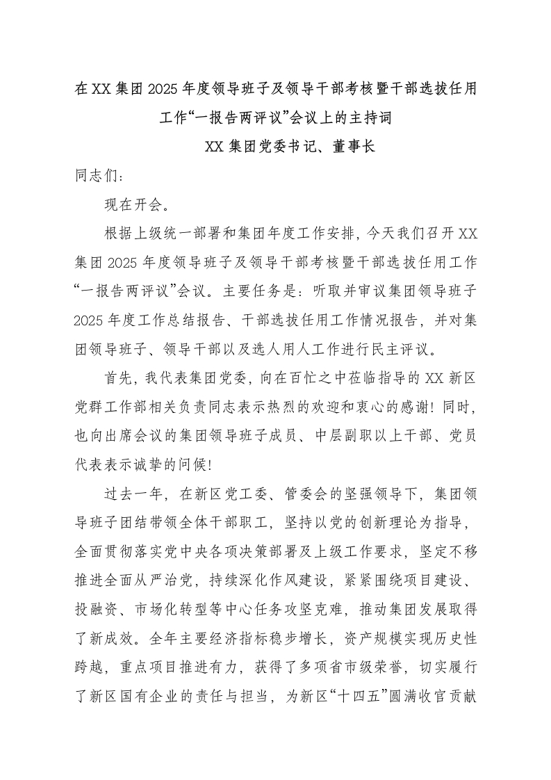 在XX集团2025年度领导班子及领导干部考核暨干部选拔任用工作“一报告两评议”会议上的主持词XX集团党委书记、董事长同志们:现在开会。根据上级统一部署和集团年度工作安排,今天我们召开XX集团2025年度领导班子及领导干部考核暨干部选拔任用工作“一报告两评议”会议。主要任务是:听取并审议集团领导班子2025年度工作总结报告、干部选拔任用工作情况报告,并对集团领导班子、领导干部以及选人用人工作进行民主评议。首先,我代表集团党委,向在百忙之中莅临指导的XX新区党群工作部相关负责同志表示热烈的欢迎和衷心的感谢!同时,也向出席会议的集团领导班子成员、中层副职以上干部、党员代表表示诚挚的问候!过去一年,在新区党工委、管委会的坚强领导下,集团领导班子团结带领全体干部职工,坚持以党的创新理论为指导,全面贯彻落实党中央各项决策部署及上级工作要求,坚定不移推进全面从严治党,持续深化作风建设,紧紧围绕项目建设、投融资、市场化转型等中心任务攻坚克难,推动集团发展取得了新成效。全年主要经济指标稳步增长,资产规模实现历史性跨越,重点项目推进有力,获得了多项省市级荣誉,切实履行了新区国有企业的责任与担当,为新区“十四五”圆满收官贡献了XX力量。今天会议主要有三项议程:一是由我代表集团领导班子作2025年度工作总结报告,并报告集团2025年度干部选拔任用工作情况;二是请与会同志对集团领导班子、领导干部及选人用人工作进行民主评议;三是由我就做好下一步工作讲几点意见。下面,进行会议第一项议程:由我作集团领导班子2025年度工作总结报告和干部选拔任用工作情况报告。(报告内容略…)以上是我代表集团领导班子所作的报告。请同志们审议。下面,进行会议第二项议程:开展民主评议。请工作人员分发民主评议表。请同志们本着对组织、对事业、对同志高度负责的态度,认真审阅报告,实事求是、客观公正地填写评议意见。填好后,请将评议表投入指定票箱。(进行民主评议环节…)同志们,民主评议表已回收完毕。相关情况将由上级指导组和集团党群工作部按规定汇总统计和上报。同志们,2026年是实施“十五五”规划的开局之年,也是集团深化改革、锻造核心竞争力的关键之年。做好今年工作,意义重大、任务艰巨。我们要以此次考核评议为契机,进一步统一思想、凝聚共识:一要持续加强政治建设。始终把党的政治建设摆在首位,深入学习贯彻党的二十届四中全会精神及上级各项决策部署,