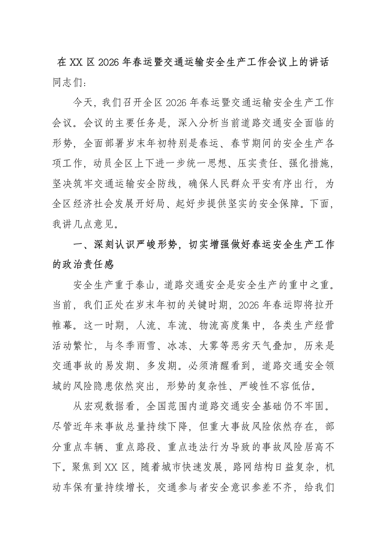 在XX区2026年春运暨交通运输安全生产工作会议上的讲话同志们:今天,我们召开全区2026年春运暨交通运输安全生产工作会议。会议的主要任务是,深入分析当前道路交通安全面临的形势,全面部署岁末年初特别是春运、春节期间的安全生产各项工作,动员全区上下进一步统一思想、压实责任、强化措施,坚决筑牢交通运输安全防线,确保人民群众平安有序出行,为全区经济社会发展开好局、起好步提供坚实的安全保障。下面,我讲几点意见。一、深刻认识严峻形势,切实增强做好春运安全生产工作的政治责任感安全生产重于泰山,道路交通安全是安全生产的重中之重。当前,我们正处在岁末年初的关键时期,2026年春运即将拉开帷幕。这一时期,人流、车流、物流高度集中,各类生产经营活动繁忙,与冬季雨雪、冰冻、大雾等恶劣天气叠加,历来是交通事故的易发期、多发期。必须清醒看到,道路交通安全领域的风险隐患依然突出,形势的复杂性、严峻性不容低估。从宏观数据看,全国范围内道路交通安全基础仍不牢固。尽管近年来事故总量持续下降,但重大事故风险依然存在,部分重点车辆、重点路段、重点违法行为导致的事故风险居高不下。聚焦到X区,随着城市快速发展,路网结构日益复杂,机动车保有量持续增长,交通参与者安全意识参差不齐,给我们的安全管理带来了前所未有的压力。特别是春运期间,务工流、学生流、探亲流、旅游流“四流叠加”,长途客运、农村客运、城市公共交通、货运物流等运输需求全面攀升,安全监管的广度、深度和难度同步加大。近期气象预报显示,自2025年12月底至2026年2月,影响我区的冷空气活动将较为频繁,气温起伏多变,出现阶段性低温雨雪冰冻和雾霾天气的可能性较大。雨雪天气导致道路湿滑、结冰,大雾团雾导致能见度骤降,这些都将严重威胁行车安全,极大增加交通事故风险。恶劣天气与出行高峰交织,是对我们应急准备、指挥调度和现场处置能力的直接考验。因此,全区各街道(镇)、园区、各有关部门和单位必须从政治和全局的高度,深刻认识做好2026年春运及岁末年初交通运输安全生产工作的极端重要性。要牢固树立“人民至上、生命至上”理念,坚决克服通常观念、麻痹思想和侥幸心理,以“时时放心不下”的责任感和“事事落实到位”的执行力,将这项工作作为一项重大的政治任务和民生工程抓紧抓实抓细。必须时刻绷紧安全这根弦,以大概率思维应对小概率事件,以万全准备防范万一发生,全力保障人民群众生命财产安全和社会大局稳定。二、聚焦关键风险隐患,深入开展全链条起底式排查整治隐患就是事故,排查整治必须动真格、见实效。要坚持问题导向,紧盯“人、车、路、企、环境”等关键要素,立即在全