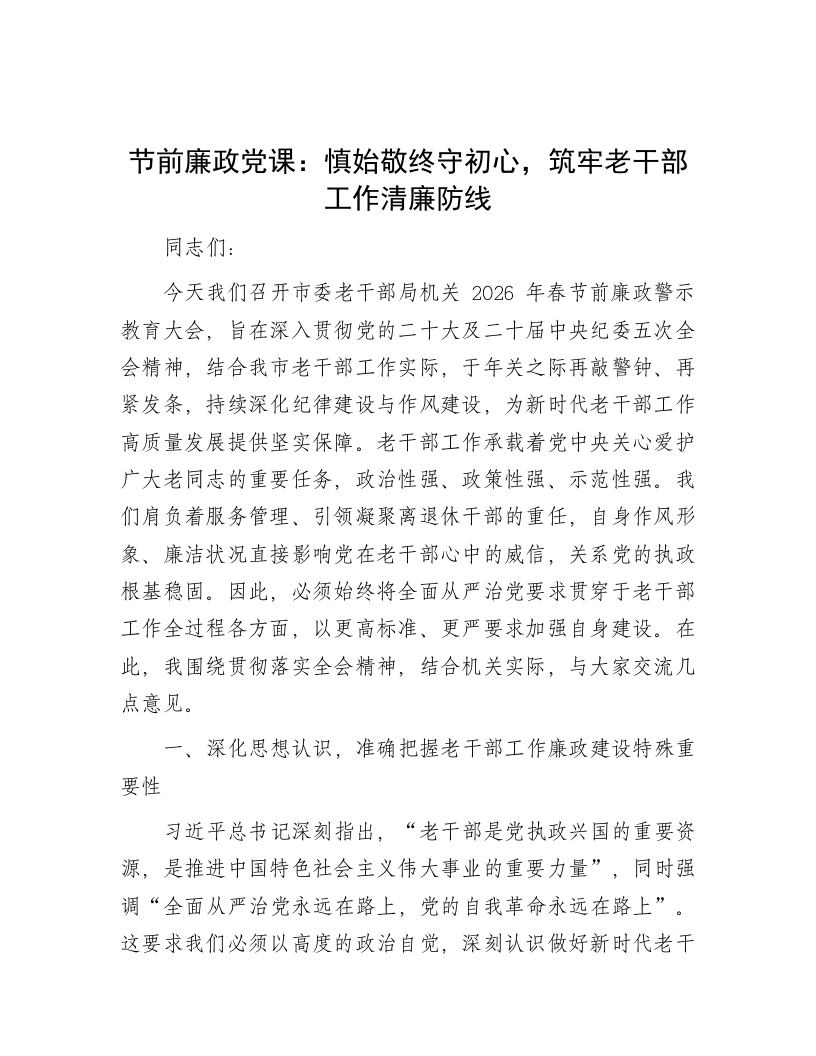 节前廉政党课:慎始敬终守初心,筑牢老干部工作清廉防线同志们:今天我们召开市委老干部局机关2026年春节前廉政警示教育大会,旨在深入贯彻党的二十大及二十届中央纪委五次全会精神,结合我市老干部工作实际,于年关之际再敲警钟、再紧发条,持续深化纪律建设与作风建设,为新时代老干部工作高质量发展提供坚实保障。老干部工作承载着党中央关心爱护广大老同志的重要任务,政治性强、政策性强、示范性强。我们肩负着服务管理、引领凝聚离退休干部的重任,自身作风形象、廉洁状况直接影响党在老干部心中的威信,关系党的执政根基稳固。因此,必须始终将全面从严治党要求贯穿于老干部工作全过程各方面,以更高标准、更严要求加强自身建设。在此,我围绕贯彻落实全会精神,结合机关实际,与大家交流几点意见。一、深化思想认识,准确把握老干部工作廉政建设特殊重要性习近平总书记深刻指出,“老干部是党执政兴国的重要资源,是推进中国特色社会主义伟大事业的重要力量”,同时强调“全面从严治党永远在路上,党的自我革命永远在路上”。这要求我们必须以高度的政治自觉,深刻认识做好新时代老干部工作所承载的政治责任,以及其中蕴含的廉政建设特殊要求。服务老同志,既是光荣使命,更是沉甸甸的政治责任,必须时刻保持清醒头脑,将廉洁自律作为履职尽责的底线红线,确保我们提供的服务纯粹、给予的关怀干净、建设的阵地纯洁,以实际行动维护好老干部部门的良好形象,不负党的重托和老同志的期望。(一)提升政治站位,深刻领悟廉政建设是老干部工作政治属性的根本保障。老干部工作本质上是政治工作,服务对象是为党和人民事业作出重要贡献的群体。我们的每一项政策落实、每一次服务保障、每一场活动组织,都体现着党的温暖和关怀,传递着党的声音和主张。如果在这个过程中出现不公、不廉、不实等问题,不仅会伤害老同志感情,更会损害党的形象,侵蚀党的执政基础。因此,必须从政治高度审视廉政风险,将严明的纪律、清廉的作风作为确保老干部工作正确政治方向的生命线。要深刻认识到,清正廉洁是赢得老同志信任、凝聚老同志力量的前提,是确保党的老干部工作方针政策不折不扣落实的基石。我们必须不断提高政治判断力、政治领悟力、政治执行力,善于从政治上分析问题、推动工作,确保老干部工作始终沿着正确方向前进,使广大老同志始终成为拥护核心、维护核心的重要力量。(二)坚守职责定位,充分认识廉政建设是提升服务管理质效的内在要求。我们的核心职责是精准精细、用心用情服务