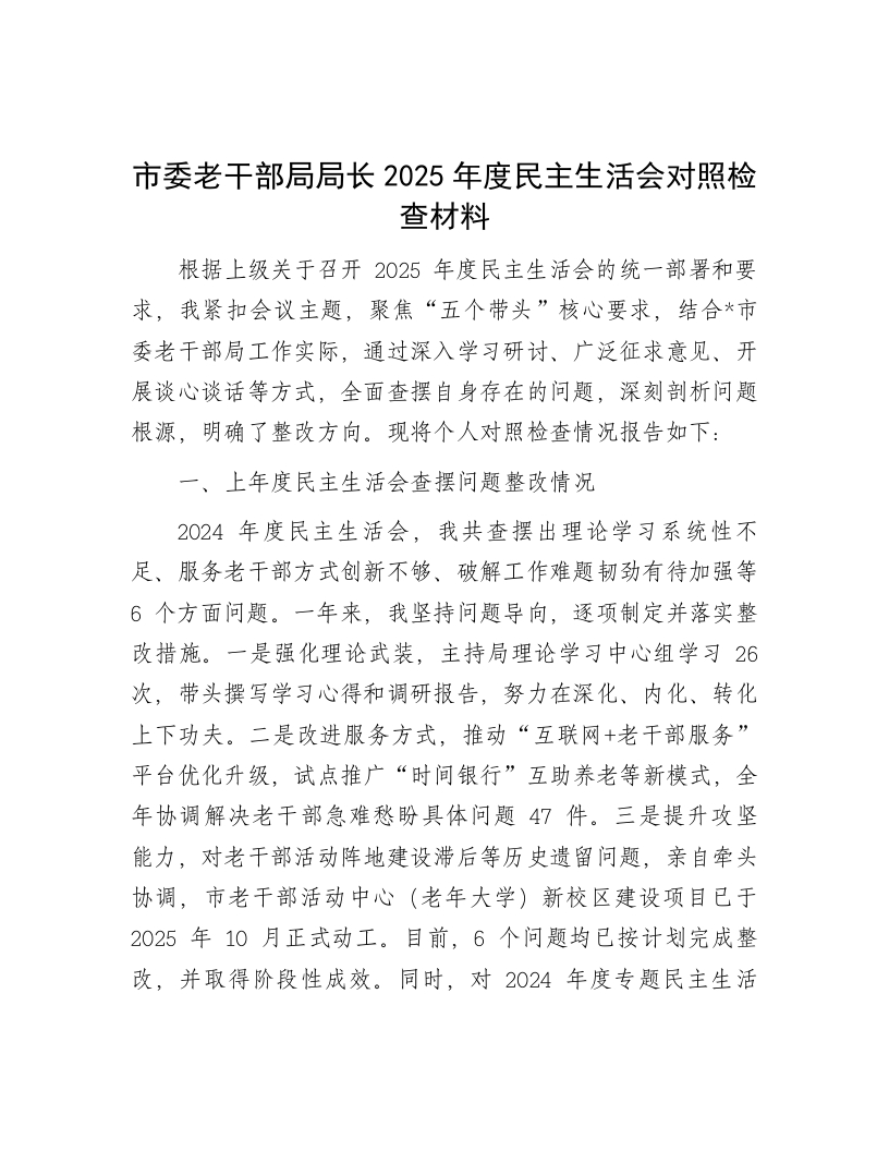 市委老干部局局长2025年度民主生活会对照检查材料根据上级关于召开2025年度民主生活会的统一部署和要求,我紧扣会议主题,聚焦“五个带头”核心要求,结合*市委老干部局工作实际,通过深入学习研讨、广泛征求意见、开展谈心谈话等方式,全面查摆自身存在的问题,深刻剖析问题根源,明确了整改方向。现将个人对照检查情况报告如下:一、上年度民主生活会查摆问题整改情况2024年度民主生活会,我共查摆出理论学习系统性不足、服务老干部方式创新不够、破解工作难题韧劲有待加强等6个方面问题。一年来,我坚持问题导向,逐项制定并落实整改措施。一是强化理论武装,主持局理论学习中心组学习26次,带头撰写学习心得和调研报告,努力在深化、内化、转化上下功夫。二是改进服务方式,推动“互联网+老干部服务”平台优化升级,试点推广“时间银行”互助养老等新模式,全年协调解决老干部急难愁盼具体问题47件。三是提升攻坚能力,对老干部活动阵地建设滞后等历史遗留问题,亲自牵头协调,市老干部活动中心(老年大学)新校区建设项目已于2025年10月正式动工。目前,6个问题均已按计划完成整改,并取得阶段性成效。同时,对2024年度专题民主生活会尚未完全销号的问题以及日常监督中发现的新表现,均已纳入本次对照检查,持续推动整改。二、存在的问题(一)带头强化政治忠诚、提高政治能力方面一是理论学习的穿透力有待加强。虽然能坚持参加集体学习,但个人自学的系统性、钻研深度不够,满足于“读过了”“学过了”,对习近平新时代中国特色社会主义思想,特别是关于老干部工作的重要论述,如何更精准地结合*市情和老同志群体特点进行创造性转化,思路还不够开阔。比如,在引导离退休干部党员发挥政治优势、经验优势参与基层治理时,更多是组织他们参加传统宣讲,运用新煤体、社区议事平台等新载体凝聚和释放正能量的方法不多、效果不显。二是政治判断的敏锐性有待提升。对意识形态领域复杂斗争的警惕性有时不足,对社会上一些错误思潮可能对部分老同志思想产生的潜在影响,预判和引导不够及时主动。在落实上级决策部署时,有时存在“本本主义”,未能完全将“两个维护”的最高政治原则转化为服务老同志、做好新时代老干部工作的最生动实践,政治能力向业务效能转化的“最后一公里”有时不够顺畅。(二)带头固本培元、增强党性方面一是党性锤炼的“熔炉”温度不够恒常。有时将参加组织生活视为“任务”,以普通党员身份深入所在支部与年轻同志