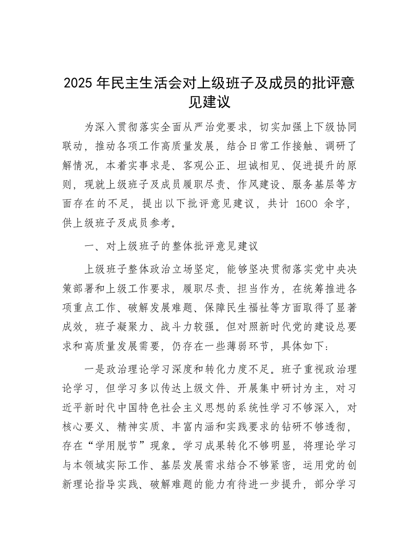 2025年民主生活会对上级班子及成员的批评意见建议为深入贯彻落实全面从严治党要求,切实加强上下级协同联动,推动各项工作高质量发展,结合日常工作接触、调研了解情况,本着实事求是、客观公正、坦诚相见、促进提升的原则,现就上级班子及成员履职尽责、作风建设、服务基层等方面存在的不足,提出以下批评意见建议,共计1600余字,供上级班子及成员参考。一、对上级班子的整体批评意见建议上级班子整体政治立场坚定,能够坚决贯彻落实党中央决策部署和上级工作要求,履职尽责、担当作为,在统筹推进各项重点工作、破解发展难题、保障民生福祉等方面取得了显著成效,班子凝聚力、战斗力较强。但对照新时代党的建设总要求和高质量发展需要,仍存在一些薄弱环节,具体如下:一是政治理论学习深度和转化力度不足。班子重视政治理论学习,但学习多以传达上级文件、开展集中研讨为主,对习近平新时代中国特色社会主义思想的系统性学习不够深入,对核心要义、精神实质、丰富内涵和实践要求的钻研不够透彻,存在“学用脱节”现象。学习成果转化不够明显,将理论学习与本领域实际工作、基层发展需求结合不够紧密,运用党的创新理论指导实践、破解难题的能力有待进一步提升,部分学习流于形式,未能真正达到“学思用贯通、知信行统一”的效果。二是履职担当的主动性和创新性不够。班子能够落实上级部署的各项工作任务,但主动谋划、超前布局的意识不够强烈,多是“按部就班”完成规定动作,缺乏“主动作为”的劲头,面对新形势、新任务、新挑战,创新思维和攻坚意识不足。在破解制约发展的瓶颈性问题、历史遗留问题上,思路不够开阔、举措不够有力,存在“求稳怕乱”的思想,部分工作推进缓慢、成效不及预期。同时,对基层工作的指导不够精准,多以会议部署、文件要求为主,实地调研、现场指导不够经常,未能及时掌握基层工作中的实际困难和问题,指导针对性、实效性不强。三是作风建设仍需持续加强,形式主义仍有残留。班子整体作风务实,但部分工作仍存在形式主义、官僚主义倾向,比如一些会议文件过多过杂,部分文件内容重复、指导性不强,基层落实负担较重;一些工作重部署、轻落实,重痕迹、轻实效,存在“走过场”现象,对工作的跟踪问效、督促检查不够严格,部分部署的工作未能落地见效。此外,班子成员深入基层、联系群众不够紧密,调研走访存在“走马观花”“蜻蜓点水”的情况,未能真正深入群众、倾听群众呼声、了解群众诉求,对基层群众反映的急难愁盼问题回应不够及时、解决不够彻底,党群干群关系仍有提升空间。