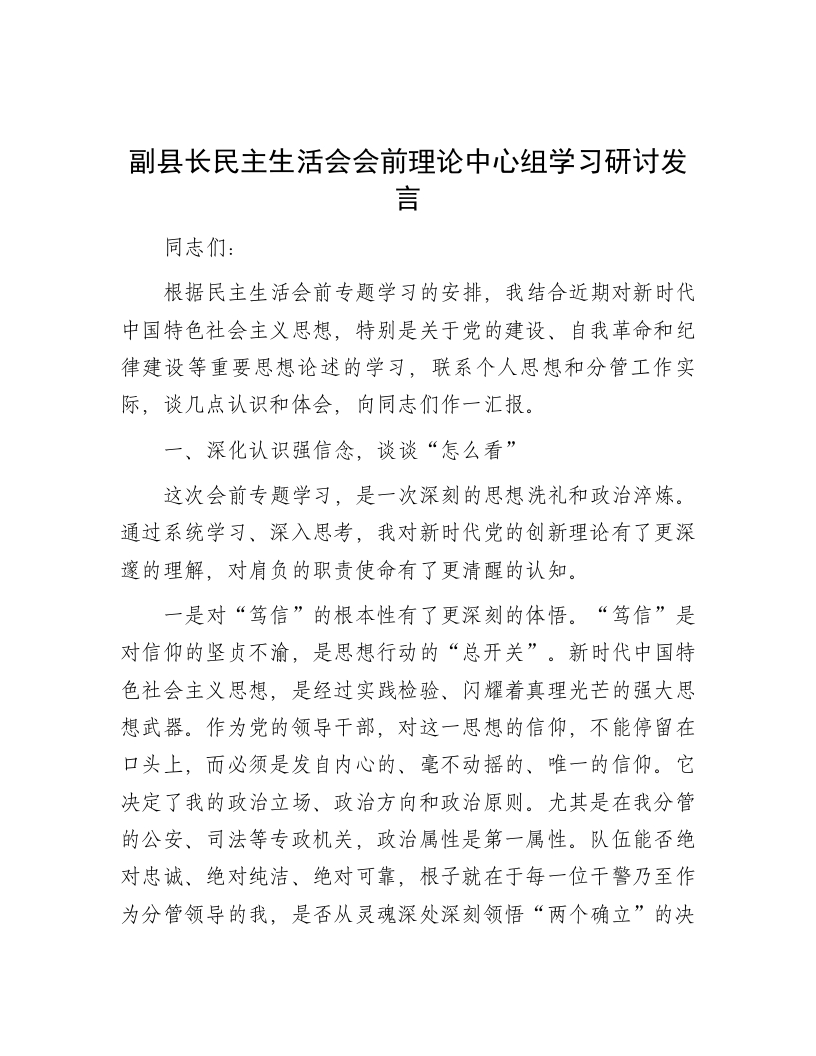 副县长民主生活会会前理论中心组学习研讨发言同志们:根据民主生活会前专题学习的安排,我结合近期对新时代中国特色社会主义思想,特别是关于党的建设、自我革命和纪律建设等重要思想论述的学习,联系个人思想和分管工作实际,谈几点认识和体会,向同志们作一汇报。一、深化认识强信念,谈谈“怎么看”这次会前专题学习,是一次深刻的思想洗礼和政治淬炼。通过系统学习、深入思考,我对新时代党的创新理论有了更深邃的理解,对肩负的职责使命有了更清醒的认知。一是对“笃信”的根本性有了更深刻的体悟。“笃信”是对信仰的坚贞不渝,是思想行动的“总开关”。新时代中国特色社会主义思想,是经过实践检验、闪耀着真理光芒的强大思想武器。作为党的领导干部,对这一思想的信仰,不能停留在口头上,而必须是发自内心的、毫不动摇的、唯一的信仰。它决定了我的政治立场、政治方向和政治原则。尤其是在我分管的公安、司法等专政机关,政治属性是第一属性。队伍能否绝对忠诚、绝对纯洁、绝对可靠,根子就在于每一位干警乃至作为分管领导的我,是否从灵魂深处深刻领悟“两个确立”的决定性意义,并将其转化为坚决做到“两个维护”的自觉行动。这种笃信,是面对复杂斗争形势时的定海神针,是抵御各种风险挑战的坚固堤坝,是我一切工作的逻辑起点。二是对“务实”的极端重要性有了更清醒的认识。求真务实,是党的思想路线的核心内容,也是自我革命的鲜明品格。县委强调的“拙诚”精神,是对务实作风的生动诠释。它要求舍得下“笨功夫”,敢于“结硬寨、打呆仗”。我深刻认识到,当前我们面临的许多工作,特别是维护社会稳定、推进司法改革、服务保障退役军人等,都没有捷径可走。任何形式主义、官僚主义,不仅解决不了问题,反而会侵蚀党的执政根基。务实,就是要坚持一切从实际出发,摸清实情、讲出实话、干出实绩。这就要求我必须深入基层一线,掌握第一手资料听取群众最真实的声音,既要做让群众看得见、摸得着的实事,也要做打基础、利长远的好事,以踏石留印、抓铁有痕的劲头推动工作。三是对“自我革命”与“纪律建设”的内在统一性有了更辩证的理解。党的自我革命是跳出治乱兴衰历史周期率的第二个答案,而严明的纪律是推进自我革命的内在要求和有力保障。没有铁的纪律,自我革命就会失去方向和力量。我分管的领域,手握执法权、司法权,是腐败问题易发高发的重点领域,更是社会公平正义的最后一道防线。2026年1月1日起施行的《军队贯彻执行〈中国共产党纪律处分条例〉的补充