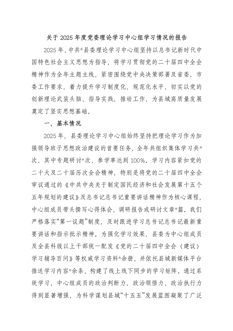 关于2025年度党委理论学习中心组学习情况的报告2025年,中共*县委理论学习中心组坚持以总书记新时代中国特色社会主义思想为指导,将学习贯彻党的二十届四中全会精神作为全年主题主线,紧密围绕党中央决策部署及省委、市委工作要求,着力提升学习制度化、规范化水平,切实以党的创新理论武装头脑、指导实践、推动工作,为县域高质量发展奠定了坚实思想基础。一、基本情况2025年,县委理论学习中心组始终坚持把理论学习作为加强领导班子思想政治建设的首要任务,全年共组织集体学习共*次,其中专题研讨*次,参学率达到100%。学习内容紧扣党的二十大及二十届历次全会精神,特别是将党的二十届四中全会审议通过的《中共中央关于制定国民经济和社会发展第十五个五年规划的建议》及总书记总书记重要讲话精神作为核心课程,中心组成员带头撰写心得体会、调研报告或研讨文章*篇。我们严格落实“第一议题”制度,及时跟进学习总书记总书记最新重要讲话和指示批示精神。为强化学习效果,县委为中心组成员及全县科级以上干部统一配发《党的二十届四中全会〈建议)学习辅导百问》等权威学习资料*余册,并依托县域新媒体平台推送学习内容*余条,构建了线上线下同步的学习矩阵。通过系统学习,中心组成员的政治判断力、政治领悟力、政治执行力得到显著增强,为科学谋划县域“十五五”发展蓝图凝聚了广泛共识。二、主要做法(一)聚焦首要任务,在深化理论武装上达到新高度。我们始终将深入学习党的创新理论,特别是党的二十届四中全会精神作为中心组学习的重中之重。一是坚持原原本本系统学。中心组成员带头逐字逐句研读党的二十届四中全会公报、《建议》及说明原文,全年围绕全会精神开展专题学习共*场次。通过反复研读、深刻领悟,准确把握“十五五”时期我国发展的指导方针、主要目标、重点任务和重大举措,深刻理解进一步全面深化改革的战略部署,确保在思想上、政治上、行动上同以总书记同志为核心的党中央保持高度一致,切实将“两个确立”的决定性意义内化于心、外化于行。二是坚持以上率下示范学。县委主要负责同志切实履行第一责任人职责,亲自审定学习计划、确定学习主题、主持集体研讨。班子成员严格执行中心组学习规则,全年开展专题研讨次,每人至少作*次重点发言,并结合分管领域工作撰写高质量调研报告*篇,示范带动全县各级党委(党组)理论学习中心组开展专题学习共*余场次,形成了“关键少数”领头学、广大干部跟进学的生动局面。三是坚持联系实际深入学。大力弘扬理论联系实际的马克思主义学风,将学习贯彻党的二十届四中全会精神与谋划*县“十五五”发展紧密结合起来。中心组成员围绕构建现代化产业体系、全面推进乡村振兴、加强生态文明建设等重大课题,深入基层一线开展