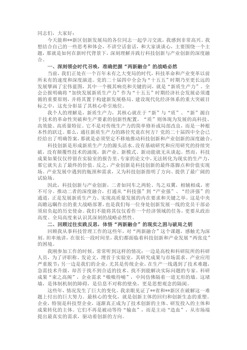同志们,大家好:今天能和**新区创新发展局的各位同志一起学习交流,我感到非常高兴。我想结合自己的一些思考和体会,不讲空话套话,和大家谈谈心,主要围绕一个主题,那就是如何在新时代背景下,深刻理解并践行科技创新与产业创新的深度融合。一、深刻领会时代召唤,准确把握“两新融合”的战略必然当前,我们正处在一个百年未有之大变局的时代,科技革命和产业变革以前所未有的速度和深度演进。党的二十届四中全会为“十五五”时期乃至更长远的发展擘画了宏伟蓝图,其中一个极其响亮和关键的词,就是“新质生产力”。全会公报明确将“加快发展新质生产力”作为“十五五”时期经济社会发展必须遵循的重要原则,并将其置于构建新发展格局、建设现代化经济体系的重大突破目标之中,这充分彰显了其核心牵引地位。我个人的理解是,新质生产力,其核心就在于“新”与“质”。“新”源自于技术的革命性突破和生产要素的创新性配置,“质”则体现为发展的高科技、高效能、高质量特征。它不是对传统生产力的简单修补或局部改良,而是一种根本性的跃迁。那么,通往新质生产力的路径究竟在何方?党的二十届四中全会已经给出了明确答案,那就是必须坚定不移地推动科技创新和产业创新的深度融合科技创新是形成新质生产力的源头活水。没有基础研究和应用研究的持续突破,没有颠覆性技术的涌现,新产业、新模式、新动能就无从谈起。然而,科技成果如果仅仅停留在实验室的报告里、专家的论文中,无法转化为现实的生产力,那它就失去了最终的价值。反之,产业创新是科技创新的最终落脚点和价值实现场。产业发展中遇到的瓶颈和需求,又为科技创新指明了方向、提供了最广阔的试验场。因此,科技创新与产业创新,二者如同车之两轮、鸟之双翼,相辅相成,密不可分。推动二者的深度融合,打通从“科技强”到“产业强”、“经济强”的通道,正是发展新质生产力、实现高质量发展的内在要求和关键之举。这是中央高瞻远瞩作出的重大战略部署,也是我们每一位身处创新发展一线的党员干部必须肩负起的历史使命。我们不能将其仅仅看作一个经济领域的任务,更要从政治高度、全局高度来认识其深刻的战略必然性。二、回顾过往实践反思,体悟“两新融合”的现实之困与破局之钥回顾我从事科技管理工作的这些年,对“两新融合”这个课题,感触尤为深刻。坦率地讲,在很长一段时间里,我们都面临着科技创新和产业发展“两张皮”我刚参加工作的时候,常常听到这样的情况:一边是高校和科研院所的科研人员,为了评职称、发论文,埋首于实验室,其研究成果与市场需求、产业应用严重脱节:另一边是我们的企业,尤其是传统企业,在生产一线遇到了技术难题,急需技术升级,却苦于找不到合适的技术、找不到能解决实际问题的专家。科研成果“束之高阁”,企业需求“嗷嗷待哺”,中间仿佛隔着一道无形的墙。这堵墙,是体制机制的障碍,是信息不对称的壁垒,更是思想观念的隔阂。这些年,情况发生了巨大的变化。我亲眼见证了*省和*新区在破解这一难题上付出的巨大努力。最核心的变化,就是创新主体的回归和创新生态的重塑。企业,特别是科技型企业,逐渐真正成为了技术创新的主体、研发投入的主体和成果转化的主体。它们不再是被动等待“输血”,而是主动“造血”,从市场端提出最真实的需求,驱动着创新的方向。同时,我们看到越来越多的新型研发机构、产业技术研究院在*新区这片热土上拔地而生。*新区的创新平台从成立之初的寥寥3家,发展到如今的24家,其中国家级平台实现了历史性突破。这些平台不再是传统意义上的“象牙塔”,它们一头连着科研,一头接着产业,扮演着“翻译官”和“催化剂”的角色,有效地促进了知识流、技术流、资本流和人才流的交汇融合。高新技术企业数量从55家增长到342家,省级以上研发平台从20家增长到56家,这些数字背后,是创新动能的真实跃迁。反思这一过程,我认为破局的关键在于三个方面。第一,是思想观念的转变。必须彻底破除“就科技论科技、就产业论产业”的惯性思维,树立起强烈的系统思维和融合意识。第二,是体制机制的创新。要敢于打破常规,通过“揭榜挂帅”、职务科技成果赋权改革等方式,赋予科研人员更大的自主权,激发他们的创新活力,让“英雄”有用武之地。第三,是人才队伍的建设。无论是懂技术的科学家,还是懂市场的企业家,亦或是懂金融的投资家,以及像在座各位一样懂政策的管理者,都是这个复杂系统工程中不可或缺的一环。*新区高层次人才数量的显著增长,国家级领军人才从1人增至13人,就是最生动的证明。这其中的每一步探索,都充满艰辛,但也正是这些实践,为我们今天更深层次地推动“两新融合”积累了宝贵的经验,也让我个人对这项工作的复杂性、长期性和极端重要性,有了更为清醒和深刻的认识。三、立足*新区发展实际,探索“两新融合”的未来路径与青年担当党的二十届四中全会精神为我们指明了前进方向,*新区作为国家级新区,拥有“先行先试”的政策优势和使命担当,理应在推动“两新融合”、发展新质生产力上走在前列、作出示范。结合**新区的发展实际,我认为未来需要从以下几个方面精准发力。(一)瞄准未来产业,下好“先手棋”新质生产