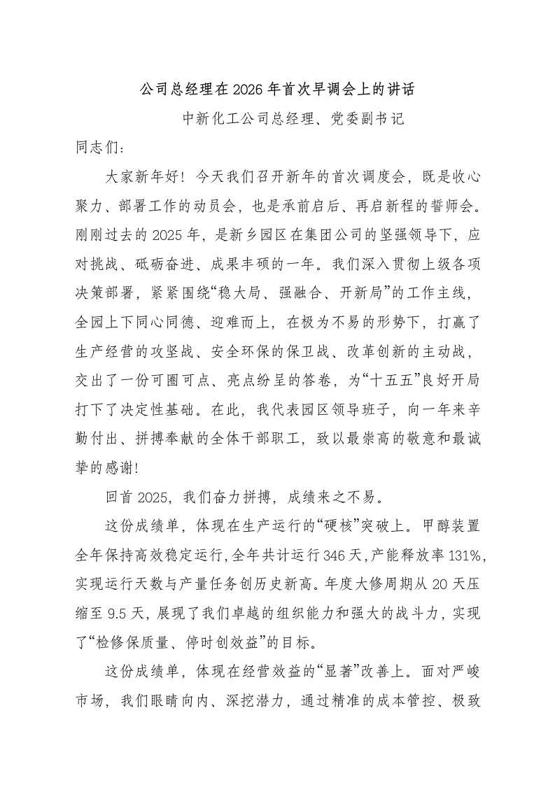 公司总经理在2026年首次早调会上的讲话中新化工公司总经理、党委副书记同志们:大家新年好!今天我们召开新年的首次调度会,既是收心聚力、部署工作的动员会,也是承前启后、再启新程的誓师会。刚刚过去的2025年,是新乡园区在集团公司的坚强领导下,应对挑战、砥砺奋进、成果丰硕的一年。我们深入贯彻上级各项决策部署,紧紧围绕“稳大局、强融合、开新局”的工作主线,全园上下同心同德、迎难而上,在极为不易的形势下,打赢了生产经营的攻坚战、安全环保的保卫战、改革创新的主动战,交出了一份可圈可点、亮点纷呈的答卷,为“十五五”良好开局打下了决定性基础。在此,我代表园区领导班子,向一年来辛勤付出、拼搏奉献的全体干部职工,致以最崇高的敬意和最诚挚的感谢!回首2025,我们奋力拼搏,成绩来之不易。这份成绩单,体现在生产运行的“硬核”突破上。甲醇装置全年保持高效稳定运行,全年共计运行346天,产能释放率131%,实现运行天数与产量任务创历史新高。年度大修周期从20天压缩至9.5天,展现了我们卓越的组织能力和强大的战斗力,实现了“检修保质量、停时创效益”的目标。这份成绩单,体现在经营效益的“显著”改善上。面对严峻市场,我们眼睛向内、深挖潜力,通过精准的成本管控、极致的“避峰就谷”、严格的“两煤”单耗控制以及多项节能降耗技改,实现同比大幅减亏超过9000万元。光伏发电、富余蒸汽和二氧化碳外售等创收举措,拓宽了增效渠道。这份成绩,凝聚着每一位员工的心血和汗水。这份成绩单,体现在安全环保的“稳固”根基上。我们始终坚持“两个至上”,安全生产实现零伤亡,隐患排查整改率高达99.36%,应急演练扎实有效,环保升级改造稳步推进。这份成绩单,体现在创新驱动的“澎湃”动能上。“工程技术研究中心”和“专精特新”企业资质的获得,标志着我们科技创新平台建设迈上新台阶。多项研发项目、技改技措落地见效,知识产权成果丰硕。这份成绩单,更体现在队伍面貌的“昂扬”斗志上。党建与生产经营深度融合,干部队伍结构优化,年轻力量得到锻炼。纪检监督保驾护航,“比学赶超”氛围浓厚,职工关怀落到实处,全体干部职工的凝聚力、向心力、战斗力显著增强。同志们,成绩属于过去,奋斗成就未来。在肯定成绩的同时,我们必须清醒认识到,扭亏脱困仍是当前最紧迫、最核心的任务,安全环保的基础仍需不断夯实,创新成果的转化效益有待进一步提升,部分环节的管理精细化水平还有提升空间。2026年,是实施“十五五”规划的关键之年,也是园区深化改革、提质增效、迈向高质量发展的攻坚之年。站在新的起点,我们面临的机遇与挑战并存,但机遇大于挑战。