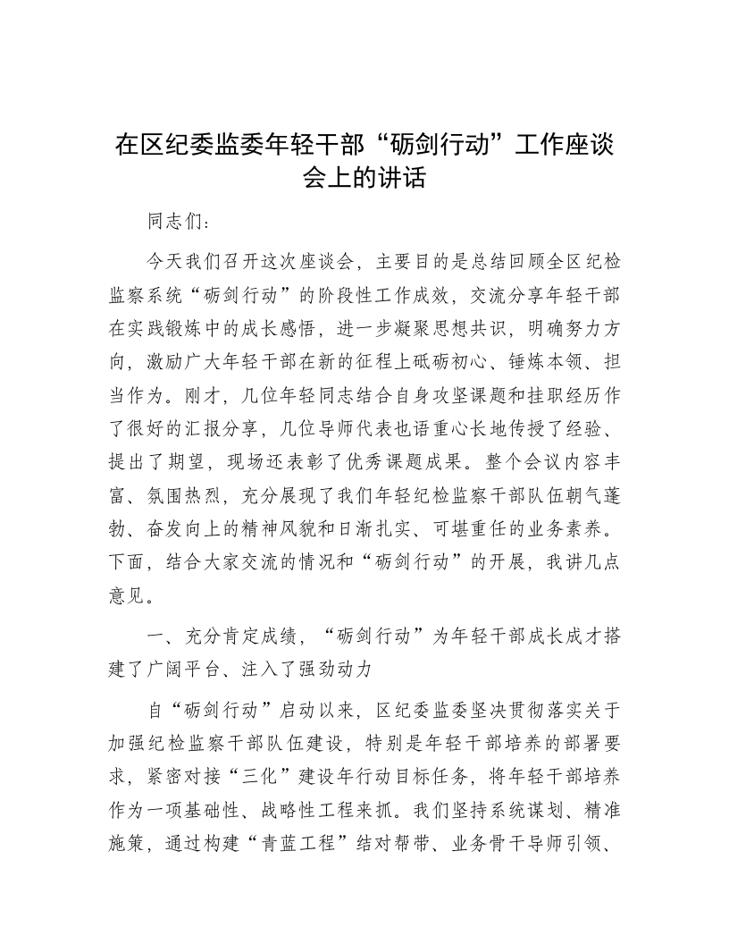 在区纪委监委年轻干部“砺剑行动”工作座谈会上的讲话同志们:今天我们召开这次座谈会,主要目的是总结回顾全区纪检监察系统“砺剑行动”的阶段性工作成效,交流分享年轻干部在实践锻炼中的成长感悟,进一步凝聚思想共识,明确努力方向,激励广大年轻干部在新的征程上砥砺初心、锤炼本领、担当作为。刚才,几位年轻同志结合自身攻坚课题和挂职经历作了很好的汇报分享,几位导师代表也语重心长地传授了经验、提出了期望,现场还表彰了优秀课题成果。整个会议内容丰富、氛围热烈,充分展现了我们年轻纪检监察干部队伍朝气蓬勃、奋发向上的精神风貌和日渐扎实、可堪重任的业务素养。下面,结合大家交流的情况和“砺剑行动”的开展,我讲几点意见。一、充分肯定成绩,“砺剑行动”为年轻干部成长成才搭建了广阔平台、注入了强劲动力自“砺剑行动”启动以来,区纪委监委坚决贯彻落实关于加强纪检监察干部队伍建设,特别是年轻干部培养的部署要求,紧密对接“三化”建设年行动目标任务,将年轻干部培养作为一项基础性、战略性工程来抓。我们坚持系统谋划、精准施策,通过构建“青蓝工程”结对帮带、业务骨干导师引领、审查调查一线压担、关键岗位轮岗交流等多维度培养链条,推动年轻干部在学中干、在干中学,取得了较为显著的阶段性成果。一是政治淬炼的熔炉作用更加凸显。我们始终将提升年轻干部的政治能力摆在首位,引导大家深刻领悟“两个确立”的决定性意义,增强“四个意识”、坚定“四个自信”、做到“两个维护”。通过持续的理论学习、严肃的党内政治生活锻炼以及在实际工作中对标对表党中央决策部署,“砺剑行动”有效促进了年轻干部政治判断力、政治领悟力、政治执行力的提升,为锻造政治过硬的纪检监察铁军奠定了坚实基础。二是实战练兵的赋能效应持续释放。行动坚持问题导向和实践导向,鼓励年轻干部跳出“舒适区”,深入监督检查、审查调查、巡察督导、信访接待等前沿一线。据统计,行动开展以来,已有数十名年轻干部参与了重大专项工作或到基层单位挂职锻炼。像今天汇报的课题,很多都来源于实践中的真问题、硬骨头。大家在攻坚克难中熟悉了业务流程,掌握了政策策略,提升了做思想政治工作、开展证据审核、运用信息化手段等多方面能力,实现了从“新兵”到“主力”的快速转变。三是严管厚爱的成长环境不断优化。我们既为年轻干部搭台子、铺路子,也坚持严管就是厚爱,常态化开展纪律教育、廉政谈话,引导大家系好廉洁从政的“第一粒扣子”。通过健全日常管理监督机制,关注年轻干部的思想动态和工作表现,