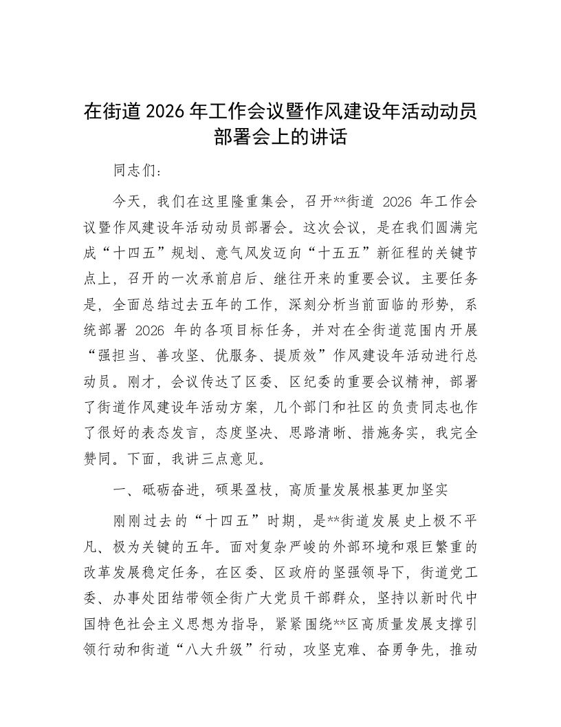 在街道2026年工作会议暨作风建设年活动动员部署会上的讲话同志们:今天,我们在这里隆重集会,召开*街道2026年工作会议暨作风建设年活动动员部署会。这次会议,是在我们圆满完成“十四五”规划、意气风发迈向“十五五”新征程的关键节点上,召开的一次承前启后、继往开来的重要会议。主要任务是,全面总结过去五年的工作,深刻分析当前面临的形势,系统部署2026年的各项目标任务,并对在全街道范围内开展“强担当、善攻坚、优服务、提质效”作风建设年活动进行总动员。刚才,会议传达了区委、区纪委的重要会议精神,部署了街道作风建设年活动方案,几个部门和社区的负责同志也作了很好的表态发言,态度坚决、思路清晰、措施务实,我完全赞同。下面,我讲三点意见。一、砥砺奋进,硕果盈枝,高质量发展根基更加坚实刚刚过去的“十四五”时期,是*街道发展史上极不平凡、极为关键的五年。面对复杂严峻的外部环境和艰巨繁重的改革发展稳定任务,在区委、区政府的坚强领导下,街道党工委、办事处团结带领全街广大党员干部群众,坚持以新时代中国特色社会主义思想为指导,紧紧围绕*区高质量发展支撑引领行动和街道“八大升级”行动,攻坚克难、奋勇争先,推动各项事业取得了令人瞩目的成就,“十四五”规划目标任务圆满完成,为开启新征程奠定了坚实基础。这五年,是我们综合实力大幅跃升、经济发展量质齐增的五年。我们始终坚持发展是第一要务,将经济建设作为中心工作紧抓不放。港产城融合发展模式的探索与实践取得了突破性进展,临港产业集群效应日益凸显。五年来,街道地区生产总值年均增长6.5%,固定资产投资累计完成超过500亿元,多项核心经济指标位居全区前列。我们成功引进了包括世界500强在内的一批龙头企业和关键配套项目,累计落地亿元以上项目超过30个,总投资额近200亿元,为经济持续健康发展注入了强劲动力。我们全力优化营商环境,深化“放管服”改革,为企业提供“店小二”式的精准服务,市场主体活力竞相迸发。这五年,是我们城市面貌焕然一新、宜居品质显著提升的五年。我们坚持以人民为中心的发展思想,投入巨资用于城市更新和基础设施建设。累计完成了28个老旧小区的改造升级工程,惠及居民超过1.5万户,曾经的“老破小”变成了环境优美、设施齐全的“幸福里”。我们打通了多条困扰群众出行多年的“断头路”,优化了区域交通微循环,新建和改建道路总里程超过30公里。生态环境治理成效卓著,空气质量优良天数比例稳定在85%以上,新增城市绿地面积15万平