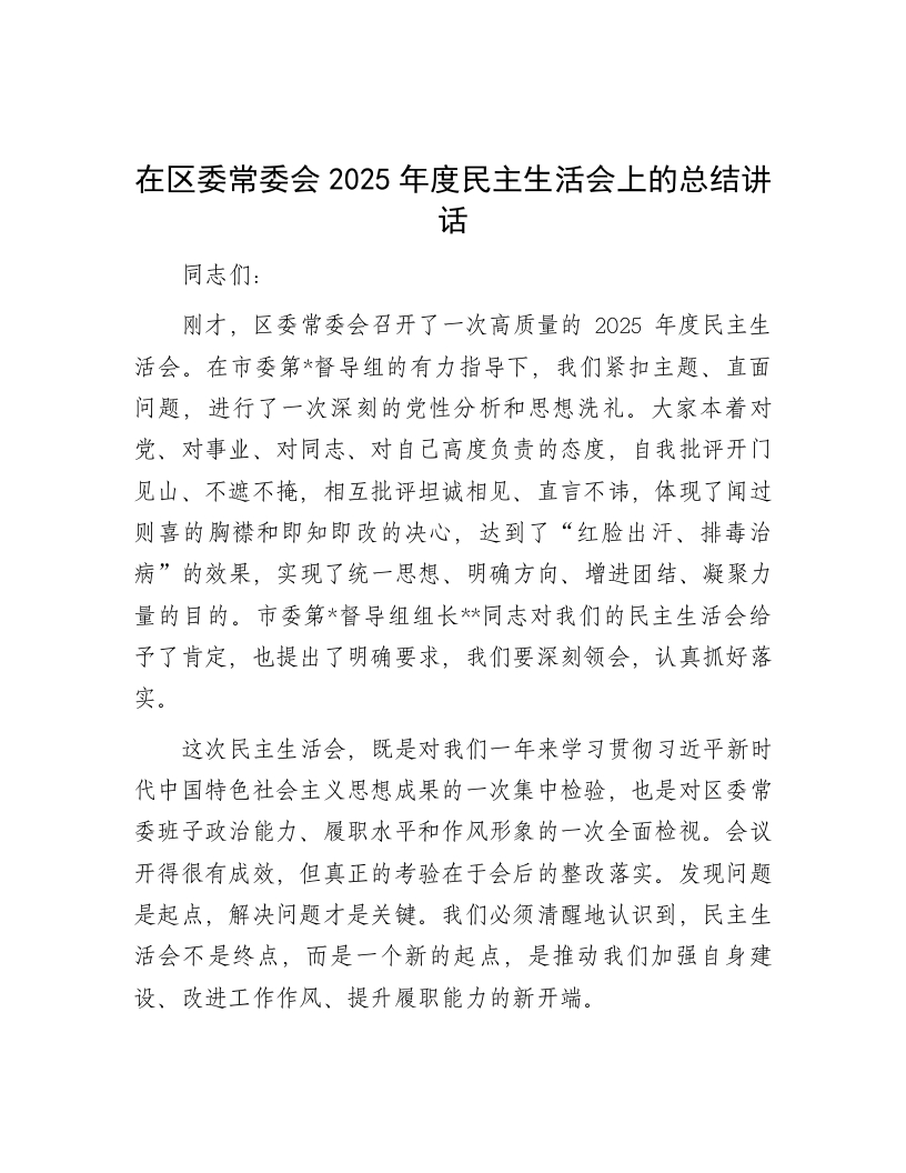 在区委常委会2025年度民主生活会上的总结讲话同志们:刚才,区委常委会召开了一次高质量的2025年度民主生活会。在市委第*督导组的有力指导下,我们紧扣主题、直面问题,进行了一次深刻的党性分析和思想洗礼。大家本着对党、对事业、对同志、对自己高度负责的态度,自我批评开门见山、不遮不掩,相互批评坦诚相见、直言不讳,体现了闻过则喜的胸襟和即知即改的决心,达到了“红脸出汗、排毒治病”的效果,实现了统一思想、明确方向、增进团结、凝聚力量的目的。市委第*督导组组长*同志对我们的民主生活会给予了肯定,也提出了明确要求,我们要深刻领会,认真抓好落实。这次民主生活会,既是对我们一年来学习贯彻习近平新时代中国特色社会主义思想成果的一次集中检验,也是对区委常委班子政治能力、履职水平和作风形象的一次全面检视。会议开得很有成效,但真正的考验在于会后的整改落实。发现问题是起点,解决问题才是关键。我们必须清醒地认识到,民主生活会不是终点,而是一个新的起点,是推动我们加强自身建设、改进工作作风、提升履职能力的新开端。今年是实施“十五五”规划的开局之年,也是我们向着“五年再造千亿*”目标奋力冲刺的关键之年。开局关系全局,起步决定后势。常委会一班人作为全区各项事业的“领头雁”和“火车头”,我们的一言一行、一举一动,都具有风向标意义。我们必须以这次民主生活会为契机,把会议成果转化为忠诚履职、实干担当的强大动力,以更高标准、更严要求、更实作风,团结带领全区广大干部群众,奋力谱写中国式现代化*新篇章。下面,我代表区委常委会,就如何巩固和拓展好这次民主生活会的成果,扎实做好“后半篇文章”,讲几点意见。一、在旗帜鲜明讲政治上作表率,筑牢绝对忠诚的思想根基政治属性是政党的第一属性,旗帜鲜明讲政治是我们党作为马克思主义政党的根本要求。区委常委会是全区政治生活的领导核心,必须在讲政治上标准更高、要求更严。一要持续深化理论武装,在“学懂”上入脑入心。要把学习贯彻习近平新时代中国特色社会主义思想作为终身必修课,坚持读原著、学原文、悟原理,深刻领会其核心要义、精神实质、丰富内涵和实践要求。要全面贯彻落实党的二十届四中全会精神和习近平总书记考察我省重要讲话精神,做到常学常新、常悟常进。要坚持把学习的落脚点放在统一思想、解决问