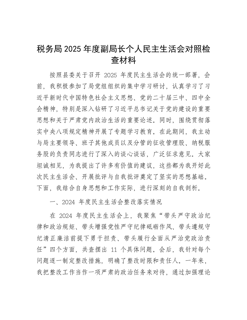 税务局2025年度副局长个人民主生活会对照检查材料按照县委关于召开2025年度民主生活会的统一部署,会前,我积极参加了局党组组织的集中学习研讨,认真学习了习近平新时代中国特色社会主义思想、党的二十届三中、四中全会精神,特别是深入钻研了习近平总书记关于党的建设的重要思想和关于严肃党内政治生活的重要论述。同时,围绕贯彻落实中央八项规定精神开展了专题学习教育。在此期间,我主动与局主要领导、班子其他成员以及分管的征收管理股、纳税服务股的负责同志进行了深入的谈心谈话,广泛征求意见。大家坦诚相见,为我提出了许多有价值的建议,这些都为我开好此次民主生活会、开展批评与自我批评奠定了坚实的思想基础。下面,我结合自身思想和工作实际,进行深刻的自我剖析。一、2024年度民主生活会整改落实情况在2024年度民主生活会上,我聚焦“带头严守政治纪律和政治规矩、带头增强党性严守纪律砥砺作风、带头遵规守纪清正廉洁前提下勇于担责、带头履行全面从严治党政治责任”四个方面,共查摆出11个具体问题。会后,我针对每个问题逐一制定整改措施,明确了整改时限和责任人。一年来,我把整改工作当作一项严肃的政治任务来对待,通过加强理论学习、深入基层调研、严格自我要求等方式,扎实推进问题整改。截至目前,原计划整改的11个问题中,9个问题已基本完成整改并将长期坚持。就“政治理论学习不够深入系统”问题,我制定了详细的学习计划,除参加党组理论学习中心组学习外,每天安排一小时进行个人自学,认真撰写学习笔记和心得体会,政治理论素养得到明显提升。针对“纳税服务精准度不够”问题,我带领纳税服务股深入企业和纳税人中间开展调研,了解他们的需求和意见,推出了“一站式”服务、预约办税等多项便民举措,纳税人满意度显著提高。另外2个问题,如“工作创新能力不足”和“对干部队伍管理不够严格”,虽已取得阶段性成效,但仍需在今后的工作中持续深化、常抓不懈,我也已将其纳入本次民主生活会的问题查摆和整改计划中。总体而言,通过上一年度的整改,我的政治站位、履职能力和工作作风都得到了进一步提升。二、存在的主要问题紧扣本次民主生活会主题,对照“五个带头”要求,我认真进行自我审视,把自己、职责和工作都摆进去,深挖思想根源,查摆出以下问题:(一)在带头强化政治忠诚、提高政治能力方面
